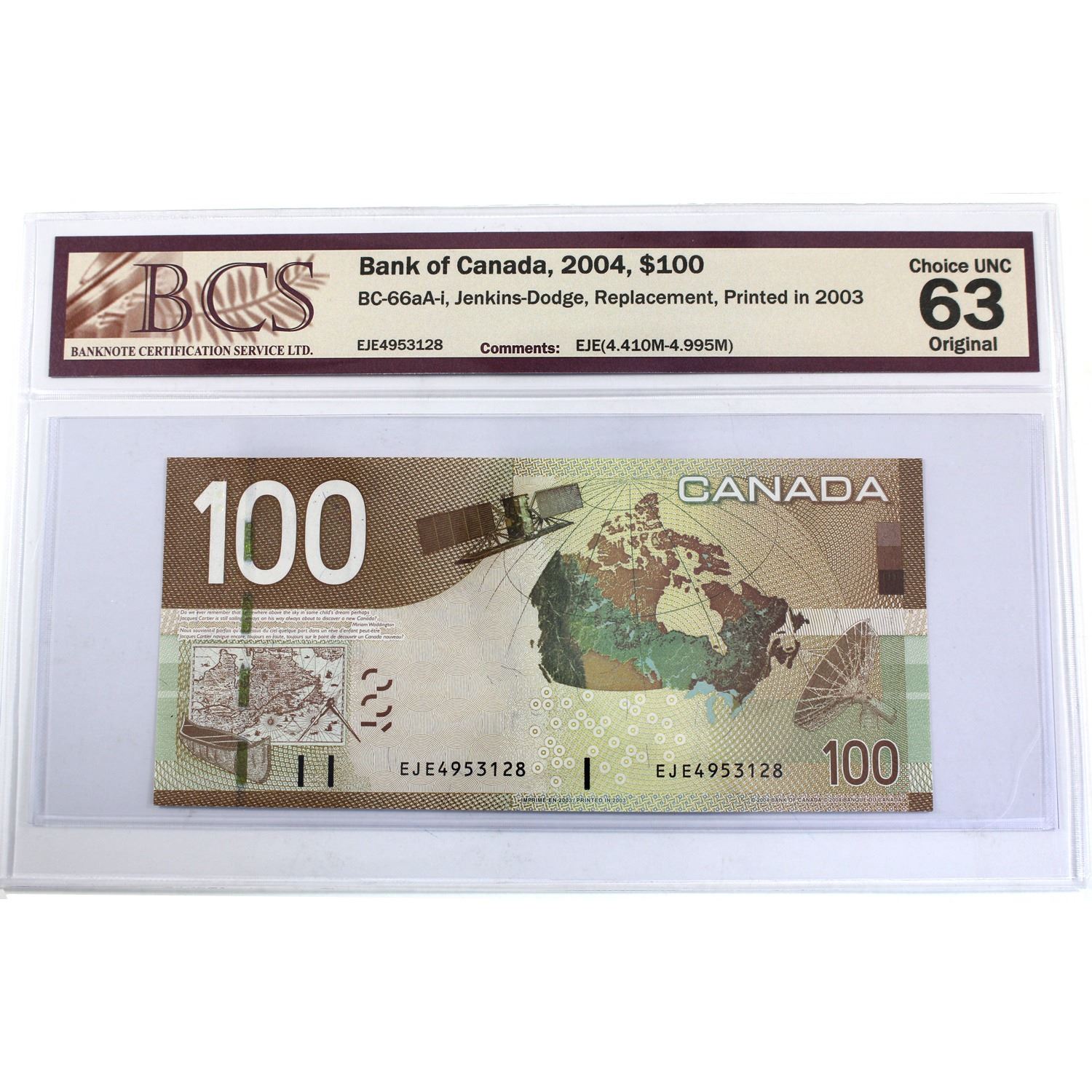 2004 $100 BC-66aA-i, Bank of Canada, Jenkins-Dodge, Replacement, Printed in 2003, S/N: EJE 4953128, BCS Certified CUNC-63 original