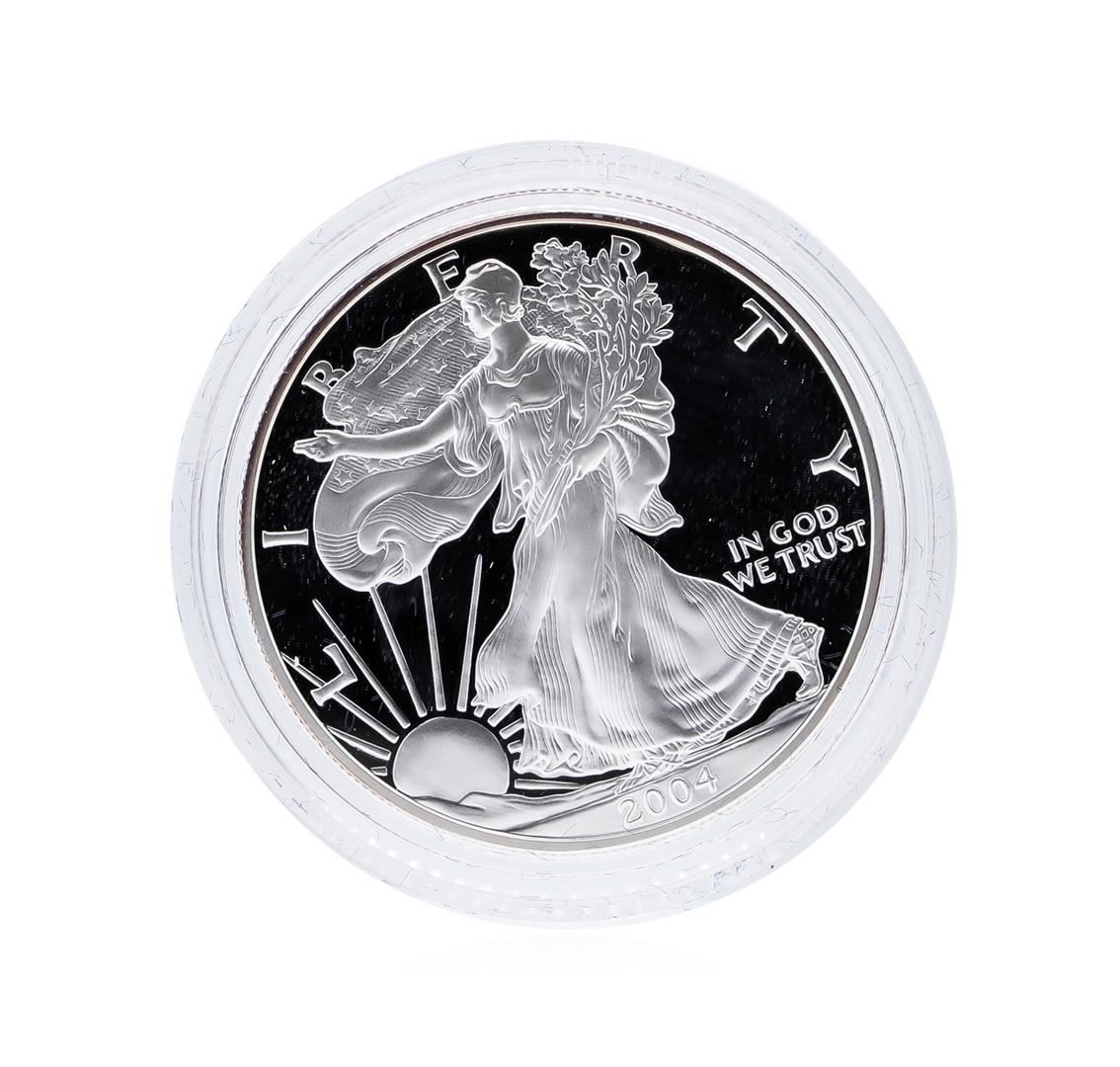One 2004 1oz American Silver Eagle Proof Coin with Box and Certificate of Authenticity. This Silver American Eagle coin's limited mintage makes it a popular choice for any collector.