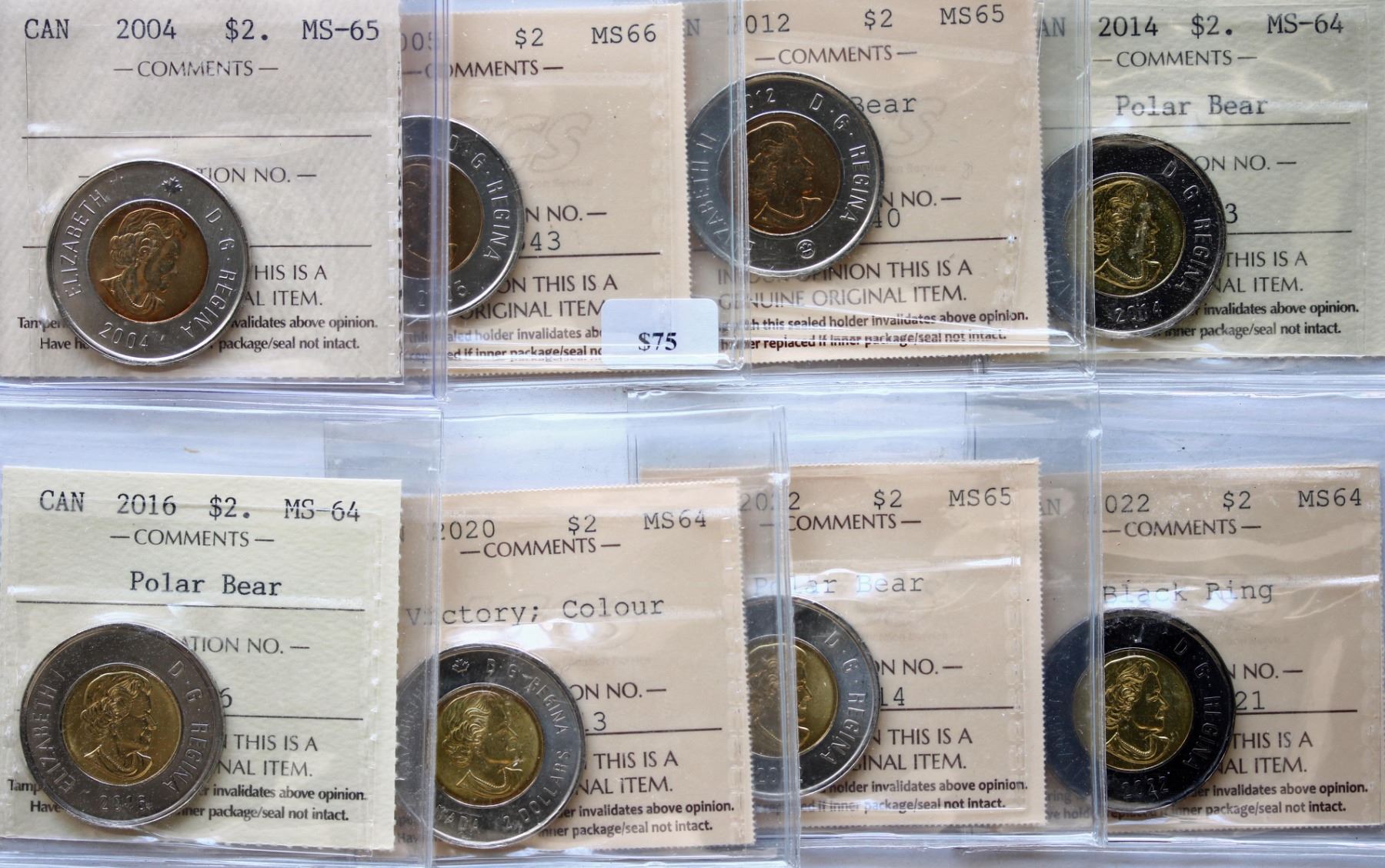 2004 $2 Toonie, 2005, 2012, 2014, 2016, 2020, 2022 & 2022 Black Ring all ICCS graded Choice Mint Sta