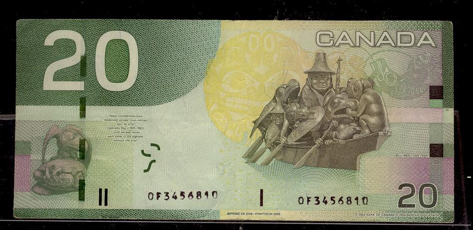 2004 $20 BC-64a ERROR Note. In our opinion, this note was issued without a serial number and a false serial number was stamped on the back after the fact, misaligned probably in order to permit the owner to cash the note. The note shows bank teller stamp on the front and serial #OF3456810 stamped on back. This serial number does not coincide with any issue of this date. VF in grade, should be viewed, sold as is, no return.