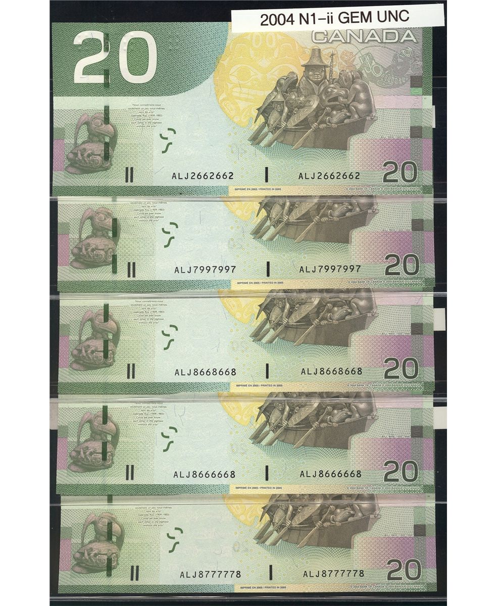 2004 $20 BC-64a-i RADAR issues. Includes #ALY2662662, 7997997, 8668668, 8666668 & 8777778. Lot of