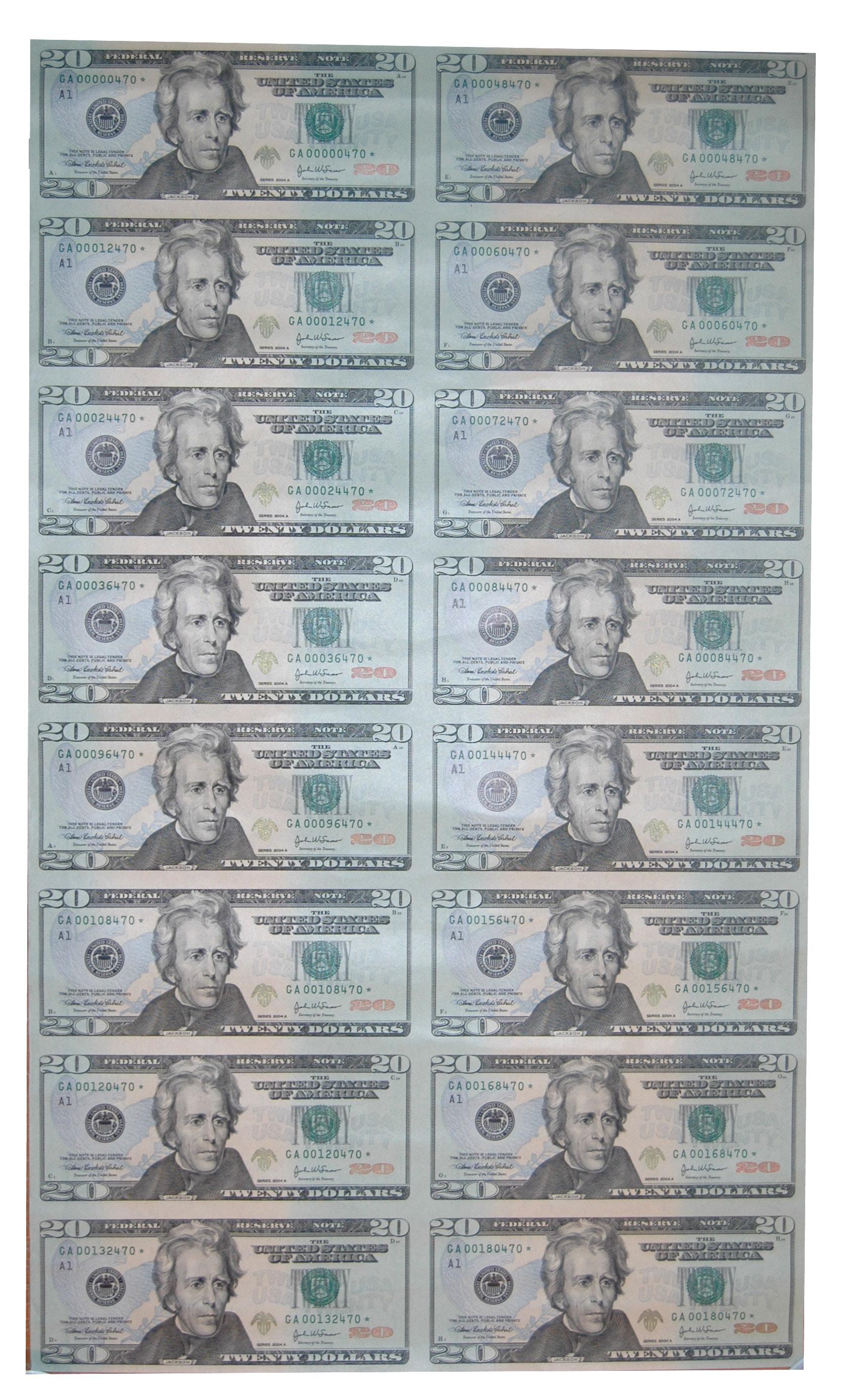 $20 Uncut Sheet of 16 -- Low Serial Numbers -- Series # are as follows: 00000470- 00048470- 00012470- 00060470- 00024470- 00072470- 00036470- 00084470- 00096470- 00144470- 00108470- 00156470- 00120470- 00168470- 00132470- 00180470