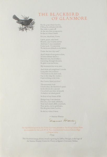 A collection of three signed limited edition broadside poems on untrimmed paper, each signed by the respective poets, printed at The King's Library Press and issued as a keepsake of the 45th and 46th W.B. Yeats International Summer School. Comprising of 'The Blackbird Of Glanmore' by Seamus Heaney (187/250), 'I See You Dancing Father' by Brendan Kennelly (162/250) and 'The Mountain Is Holding Out' by Paul Muldoon (148/300). Attractively individually framed. (3 items)
