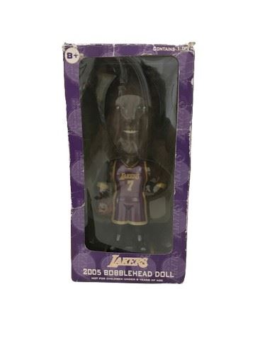 A collection of 2004-2005 Lakers bobble head dolls. Includes six dolls: Walton, Mihm, Bryant, Butler, and Odom. The lineup is listed on the back of each box detailing which one came out during each specific week. Comes with a plastic display stand to hold the five bobble heads. This was a Carl's Jr. partnership with the Lakers in 2005 to release a promotional bobbleheads collection.