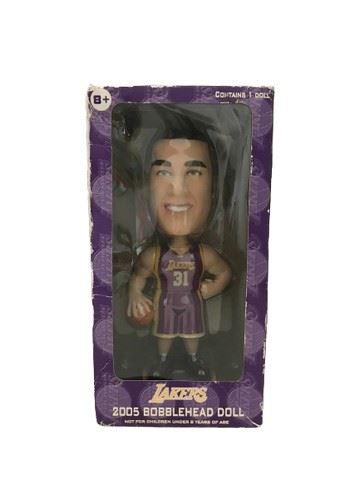 A collection of 2004-2005 Lakers bobble head dolls. Includes six dolls: Walton, Mihm, Bryant, Butler, and Odom. The lineup is listed on the back of each box detailing which one came out during each specific week. Comes with a plastic display stand to hold the five bobble heads. This was a Carl's Jr. partnership with the Lakers in 2005 to release a promotional bobbleheads collection.