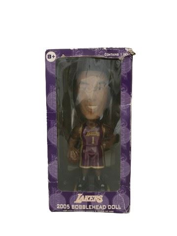 A collection of 2004-2005 Lakers bobble head dolls. Includes six dolls: Walton, Mihm, Bryant, Butler, and Odom. The lineup is listed on the back of each box detailing which one came out during each specific week. Comes with a plastic display stand to hold the five bobble heads. This was a Carl's Jr. partnership with the Lakers in 2005 to release a promotional bobbleheads collection.