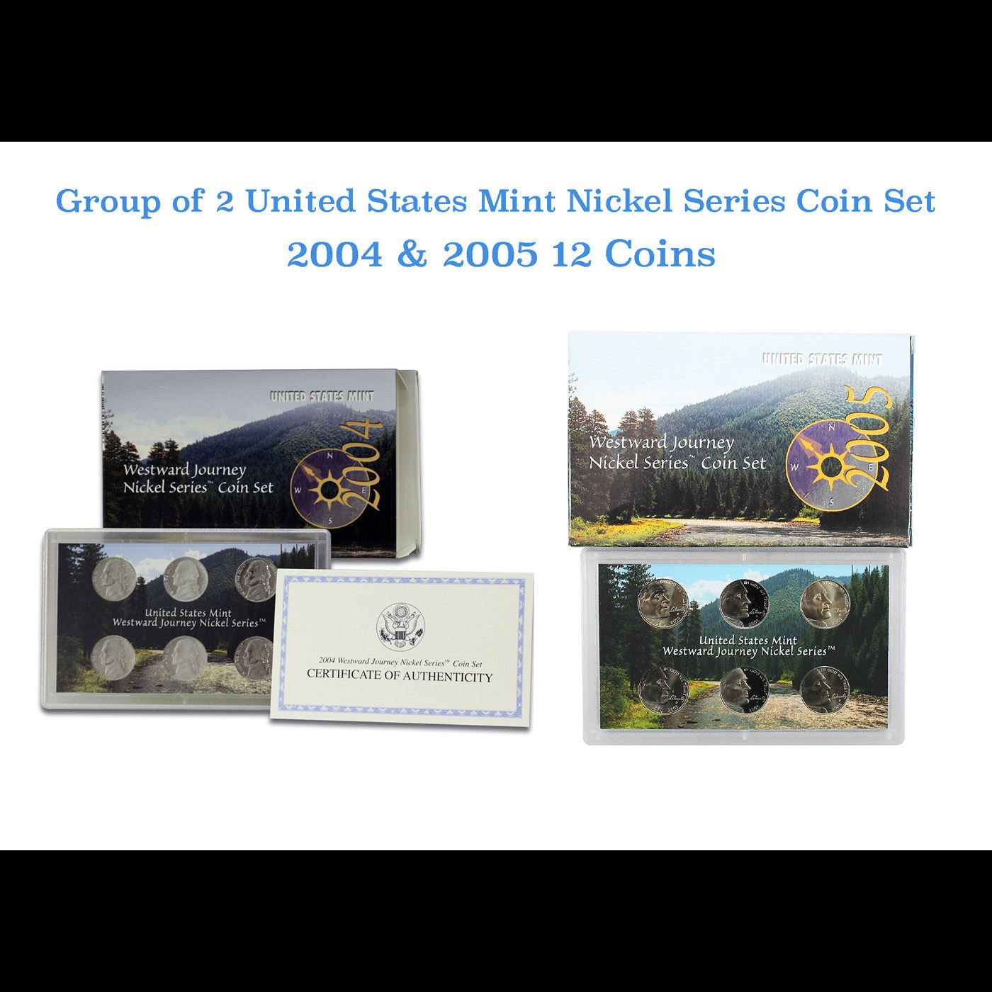 2004-2005 Westward Journey Nickel Set. 12 Coins Inside.. Group of 2 Westward Journey Nickel Set 2004-2005 12 coins. In 2004 and 2005, the Jefferson nickel featured four different designs to commemorate the bicentennials of the Louisiana Purchase and the Lewis and Clark expedition. The images were evocative of the historic expedition into the Louisiana Territory. Each set contains a P, D, and S proof versions of the Westward Journey nickel series of the of the respective year for a total of 6 coins each. The 2004 releases bear the Peace Medal and Keel Boat reverses, while the 2005 releases bear the American Bison and Ocean in View reverses .Set comes in original packaging, including COA, a protective hard plastic case and an outer box.