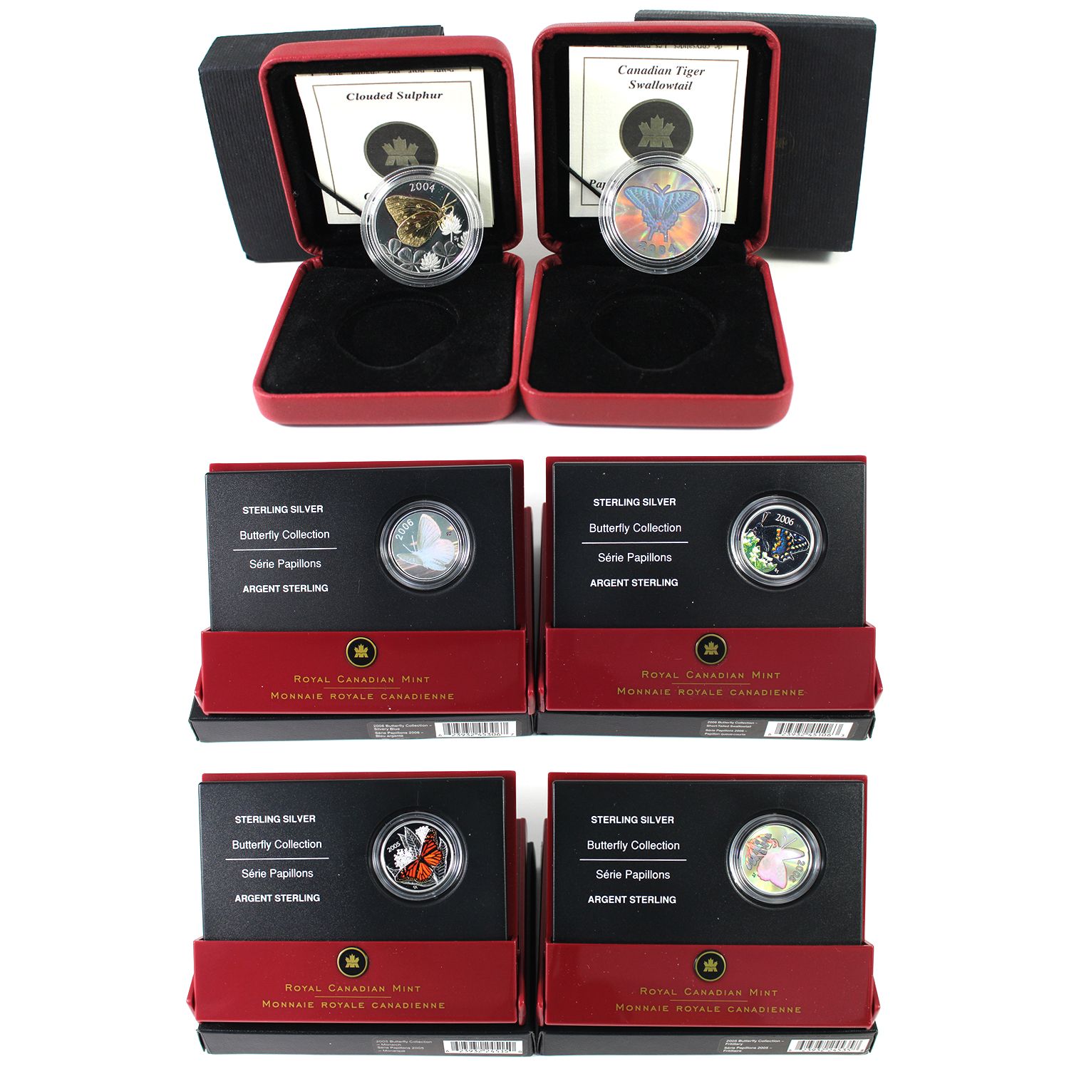 INCLUDES: 2004 Tiger Swallowtail, 2004 Clouded Sulphur, 2005 Fritillary, 2005 Monarch, 2006 Short-tailed Swallowtail & 2006 Silvery Blue 50-cents Silver Proof. Each Comes in a Display Case w/COA. 6pcs. (Tax Exempt)