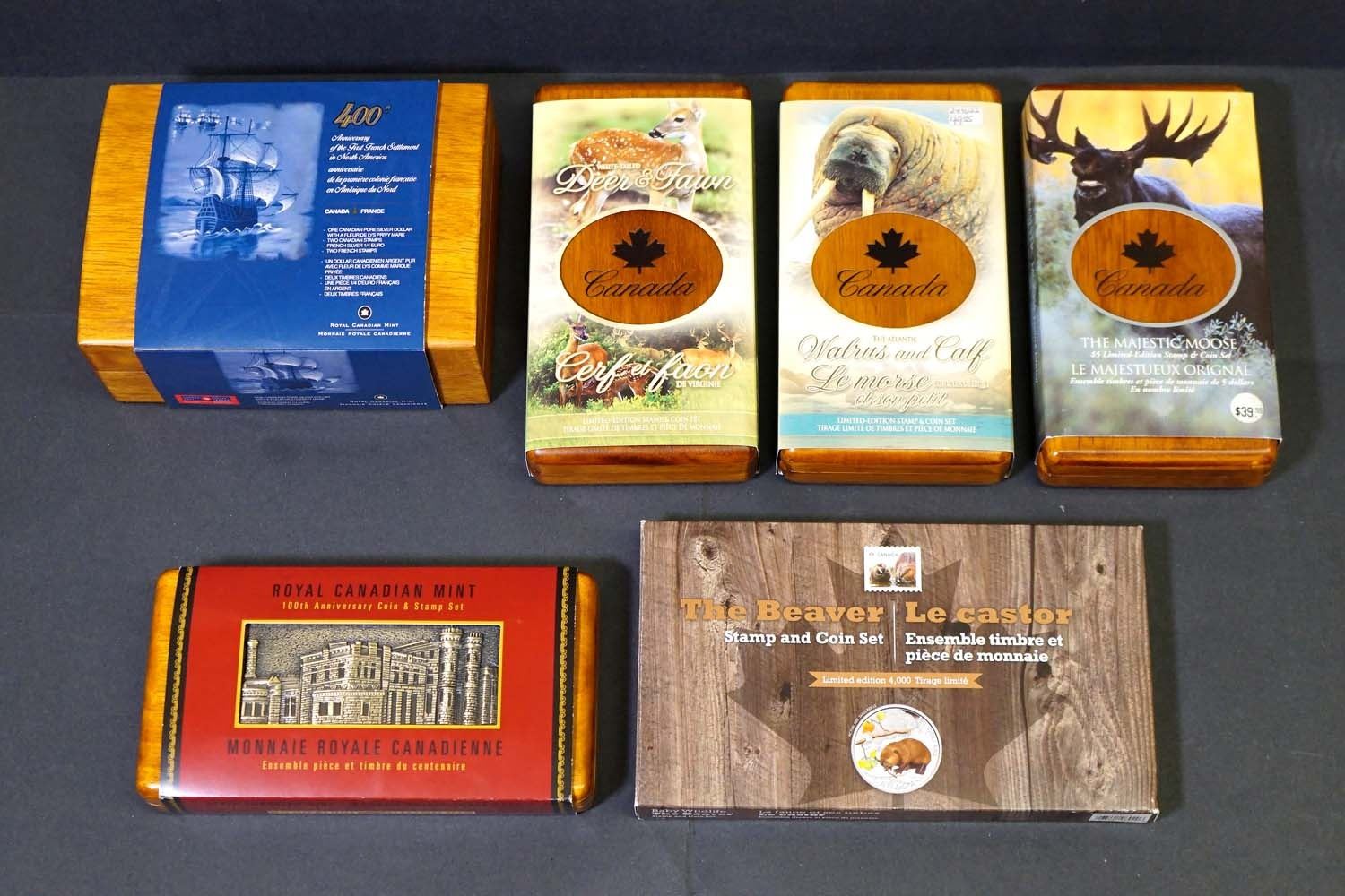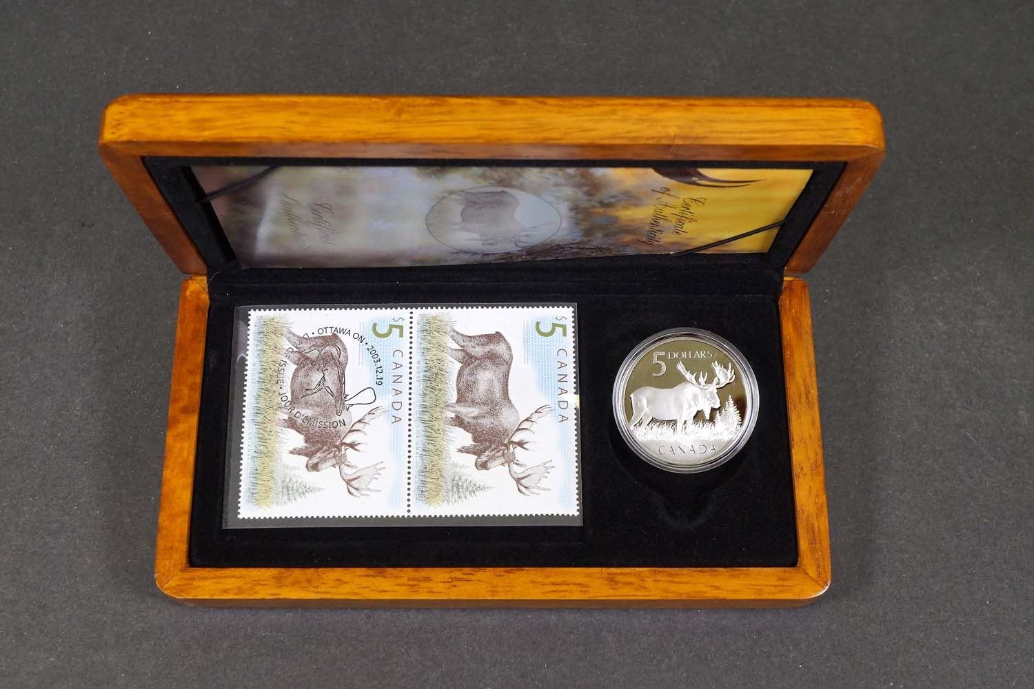 3 x $5.00 Majestic Moose, Walrus and Calf,Dear and Fawn: All with Wood Box, COA , Stamps and Sleave 1 x 2004 Ile Saint-Croix set w/2004 France 14 Euro Coin, 2004 Special Privy mark Dollar and Stamps,COA