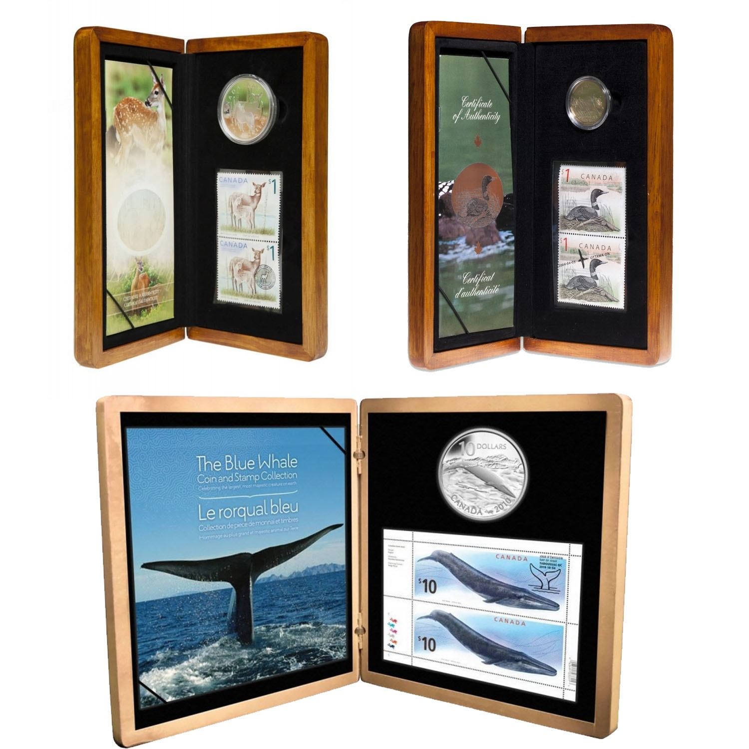 2004-2010 Canada Coins and Stamp Set Collection. You will receive the 2004 Elusive Loon set, 2005 Deer & Fawn Set, and 2010 Blue Whale Set. 3pcs.