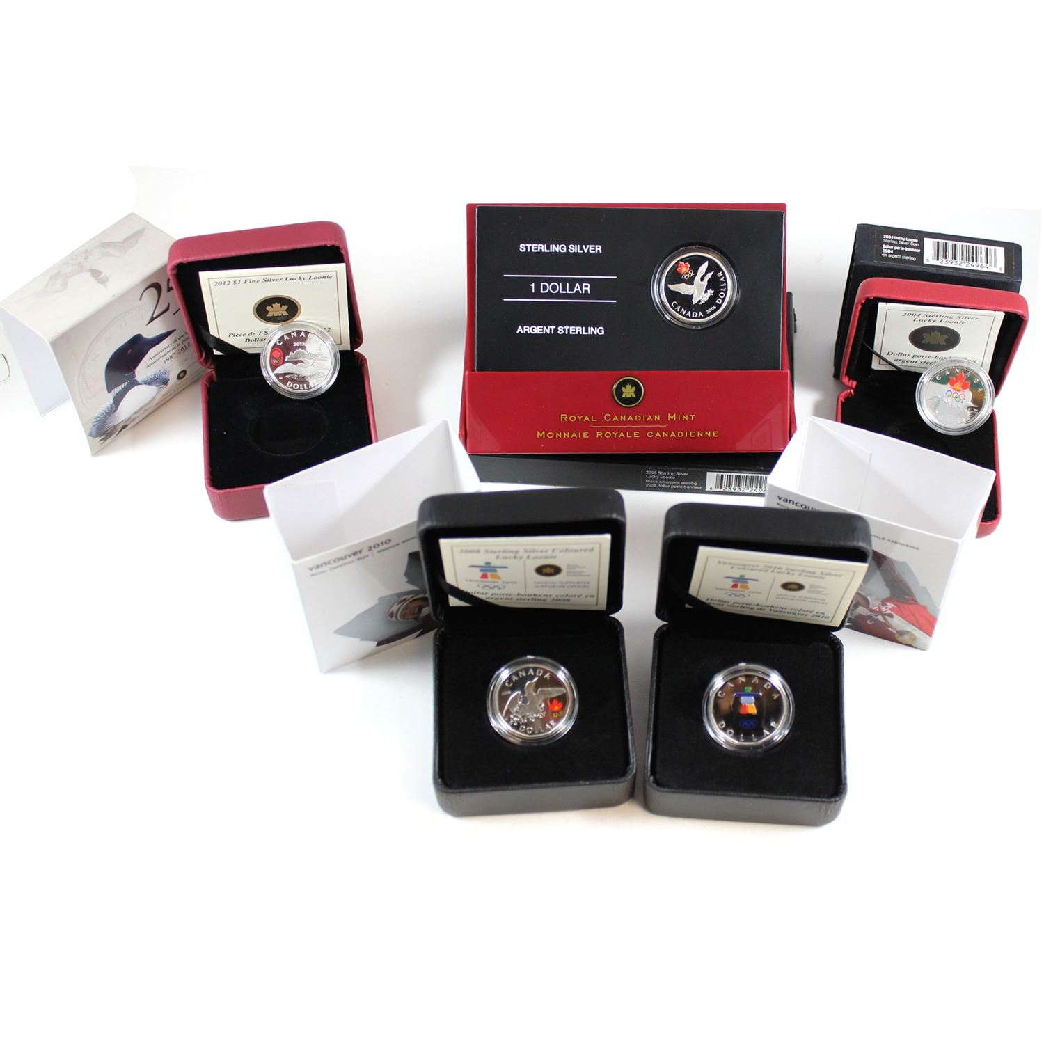 2004-2010 Canada Sterling Silver Lucky Loonies: 2004, 2006 (coin is lightly toned and outer packaging is worn), 2008 (toned), 2010 (toned) & 2012. 5pcs