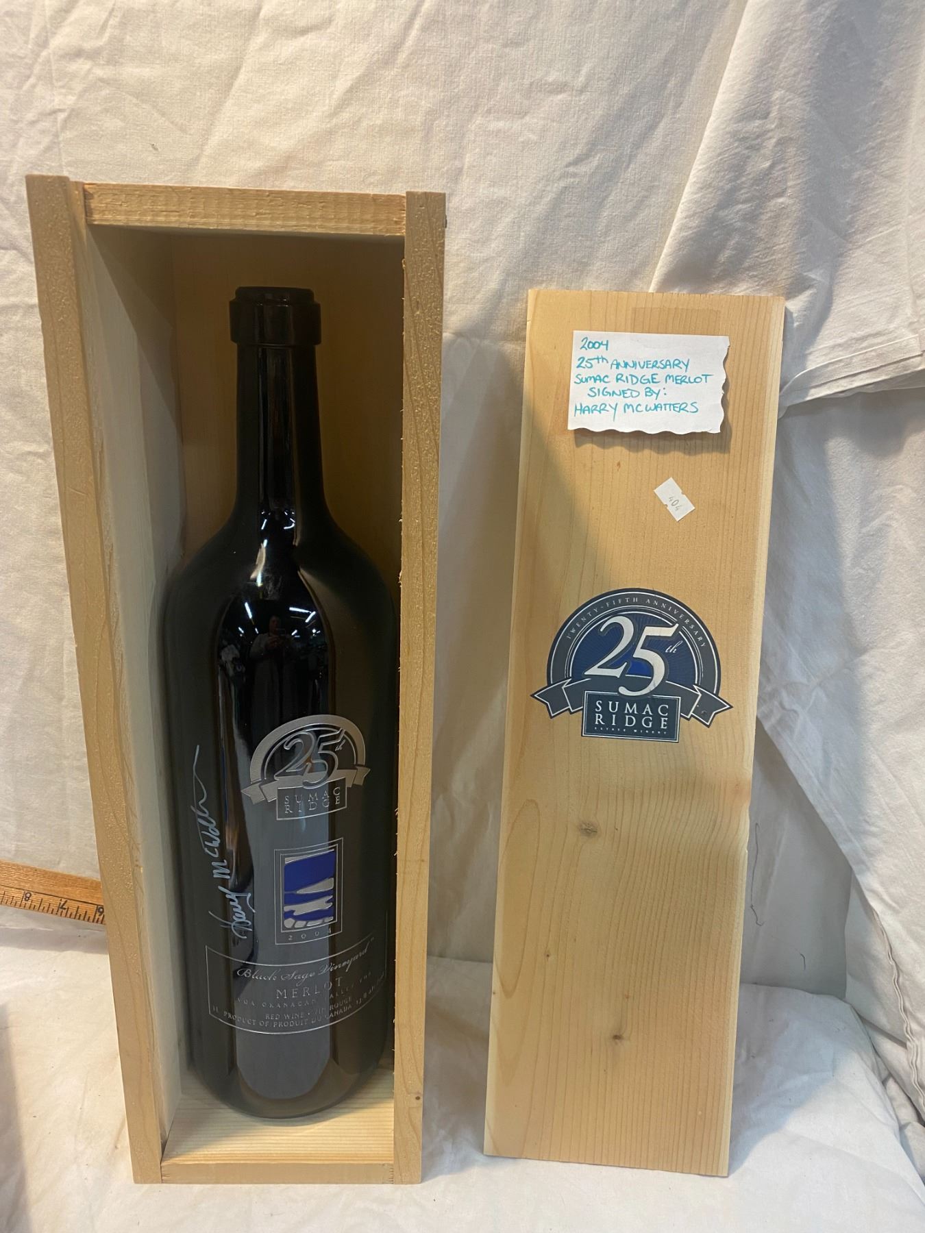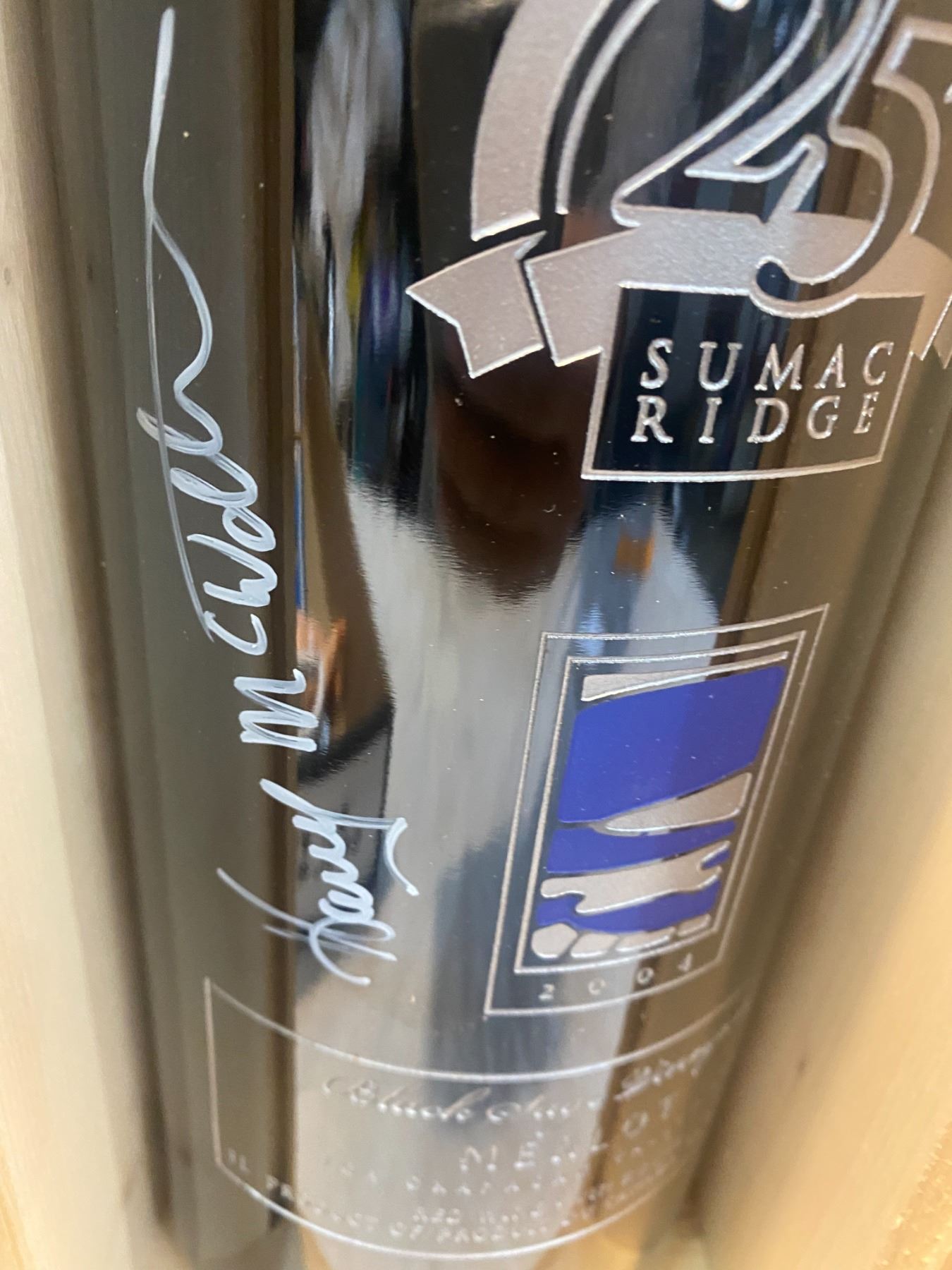 2004 25th anniversary sumac ridge merlot signed by Harry McWatters empty