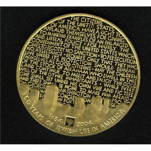 <B>2004 350 Years of Jewish Life in America PR63 Uncertified.</B></I> Gold-plated silver. #41 of 100 pieces struck, serial number on edge. Dies by Dana Krinsky. As issued aside from a few horizontal hairlines on the open obverse field.<BR><I>From The Troy Wiseman Collection.</B></I>