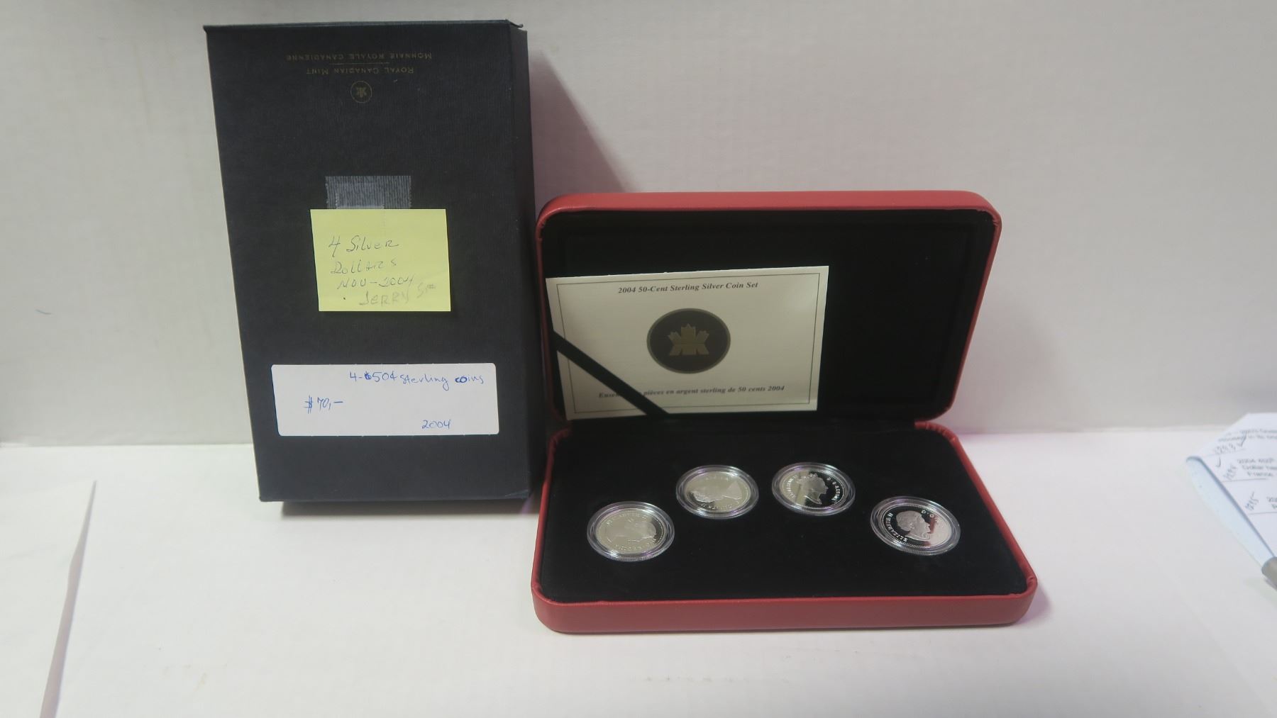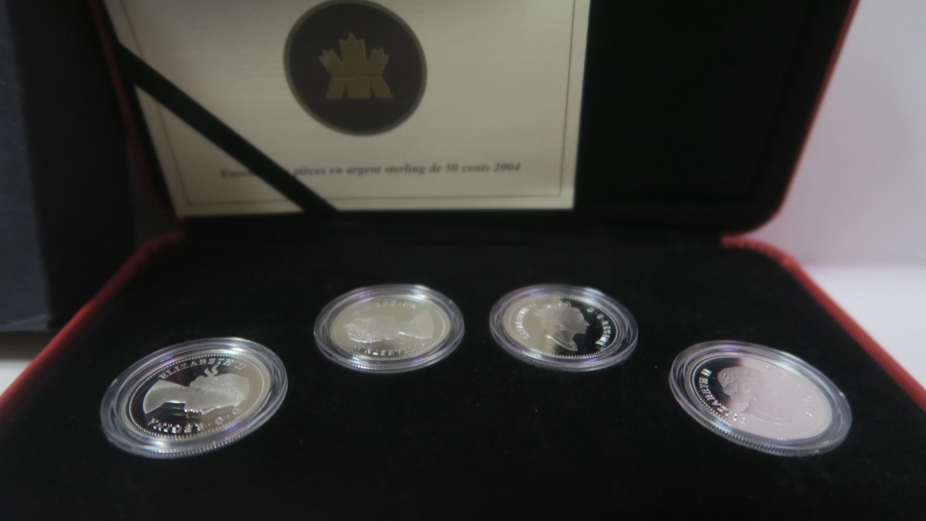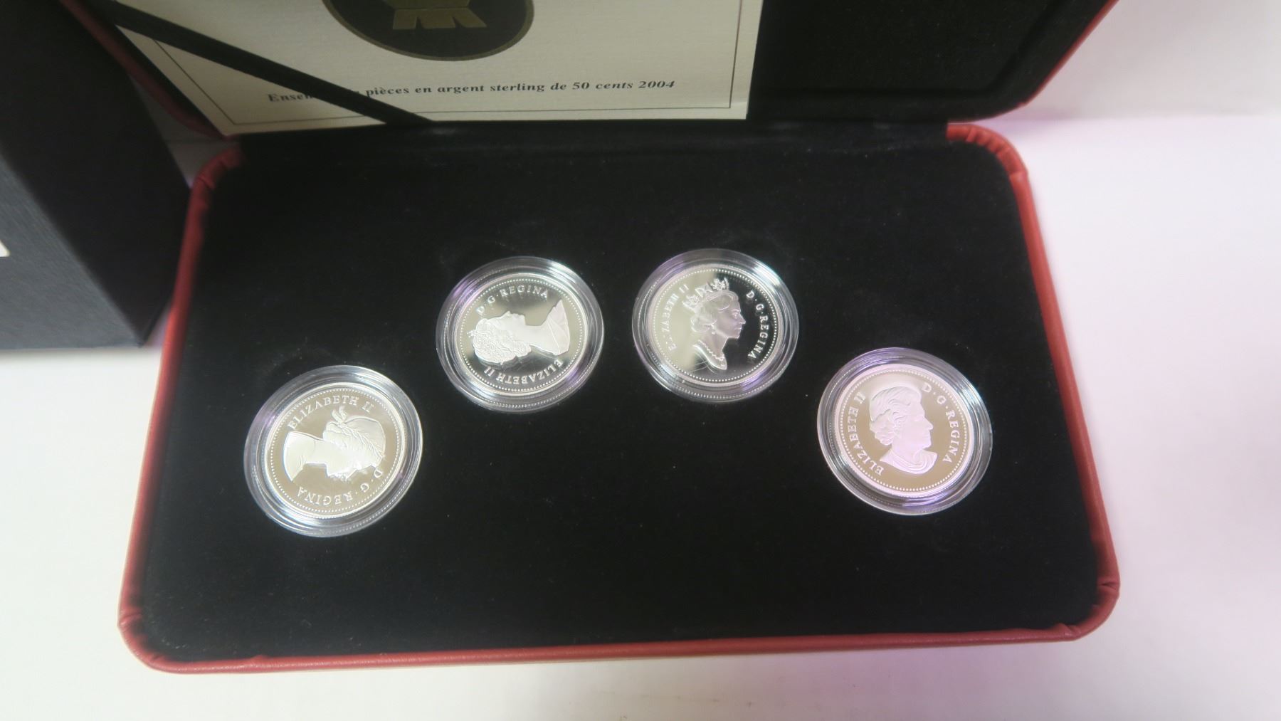 2004 4-coin Sterling Silver 50 Cents Set. The Obverse of the 4 coins shows the 4 different portraits of Queen Elizabeth. Proof. Housed in its original case and box of issue.
