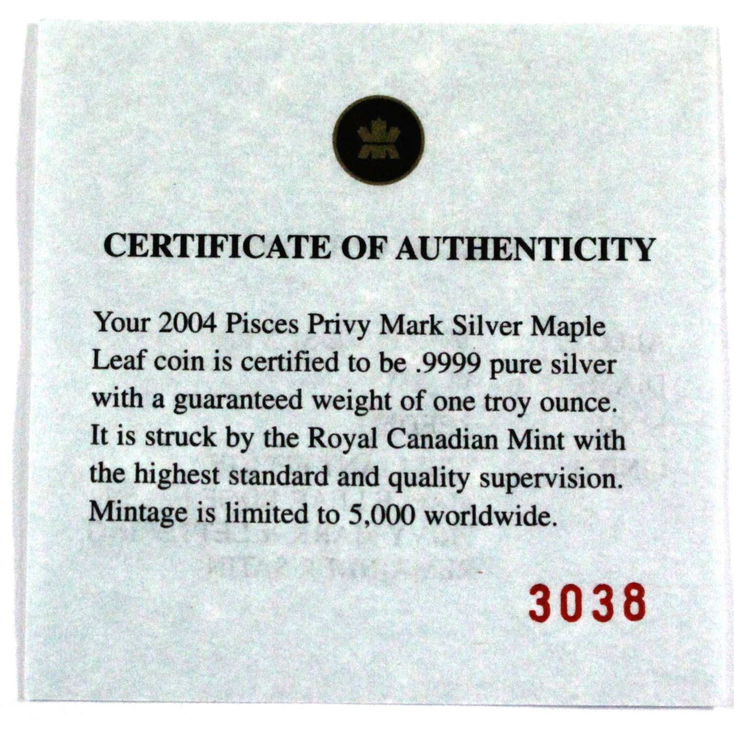 2004 $5 1oz Fine Silver Reverse Proof Pisces Privy Mark Still sealed in original Pliofilm, comes with C.O.A. (Tax Exempt)