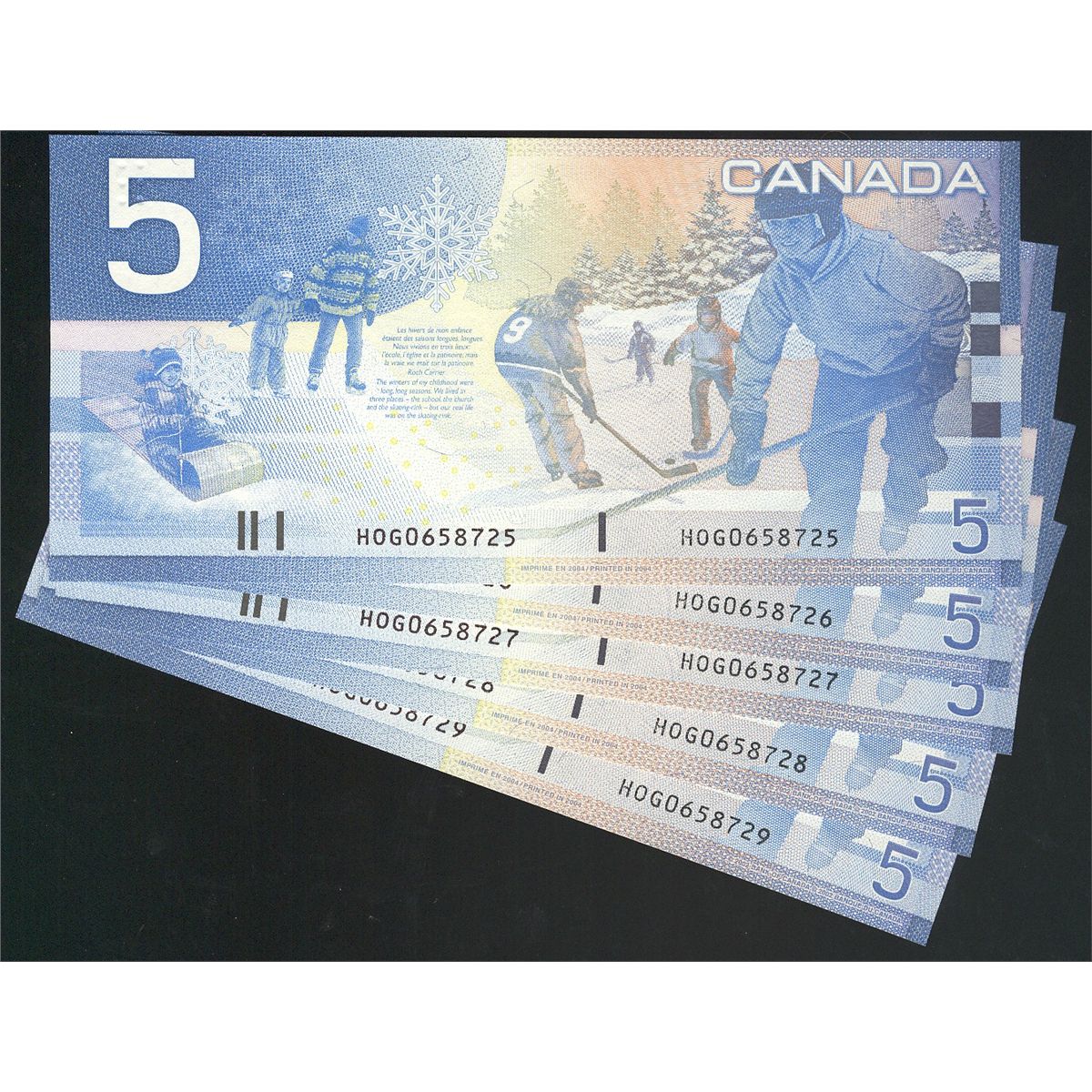 2004 $5 BC-62bA Sheet Replacement notes #HOG0658725 to 8729. Lot of 5 crisp notes.
