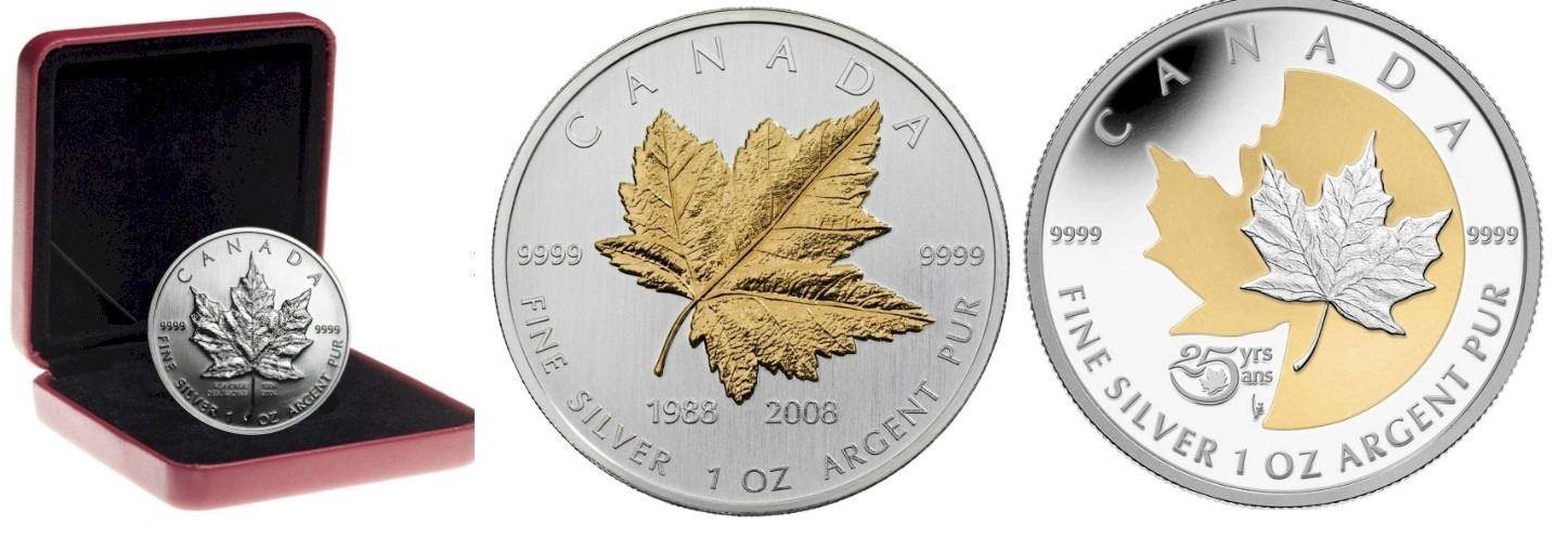 2004 $5 Silver Maple Leaf Alphonse Desjardins, 2008 20th Anniversary, and 2013 25th Anniversary of t