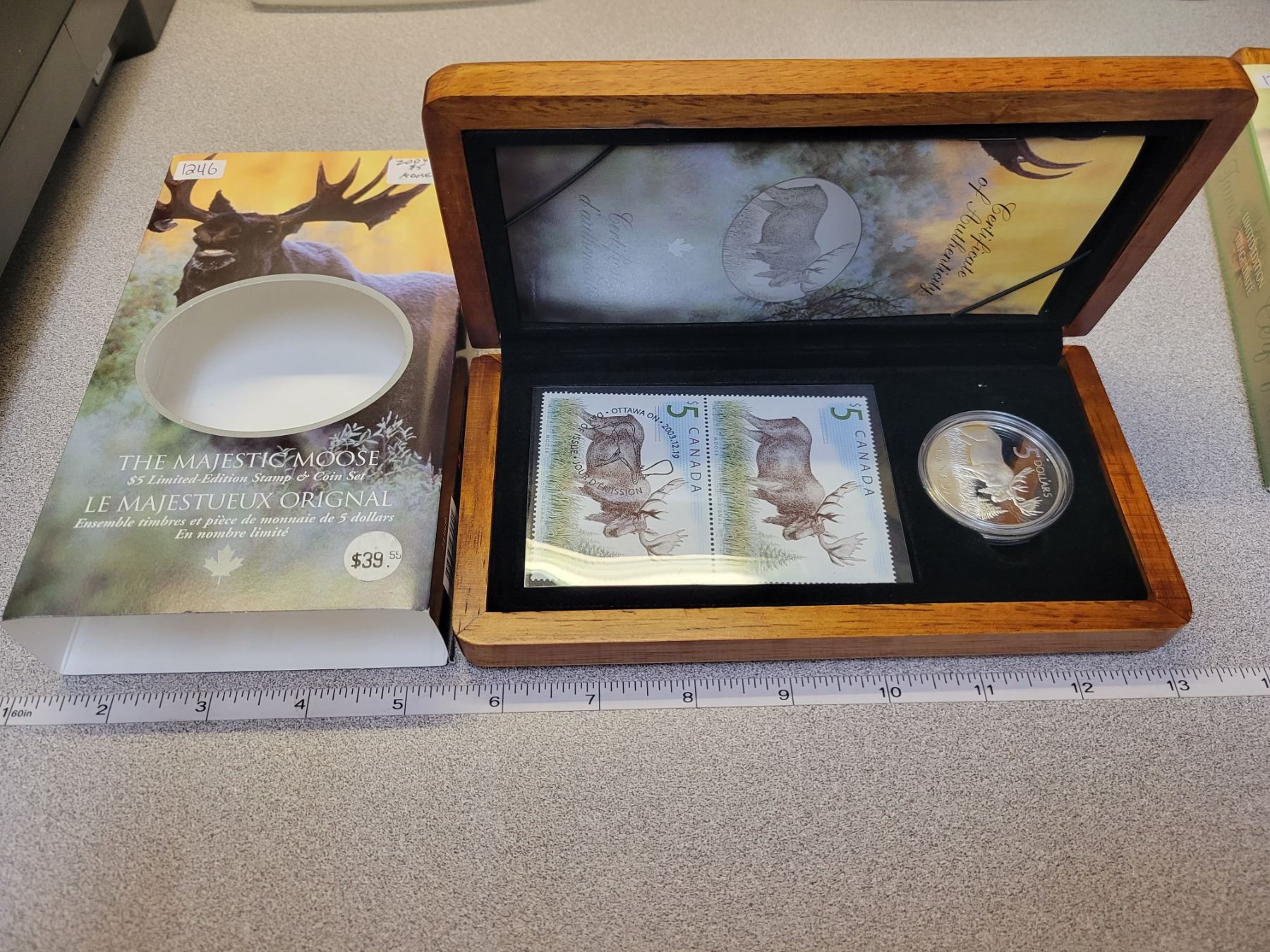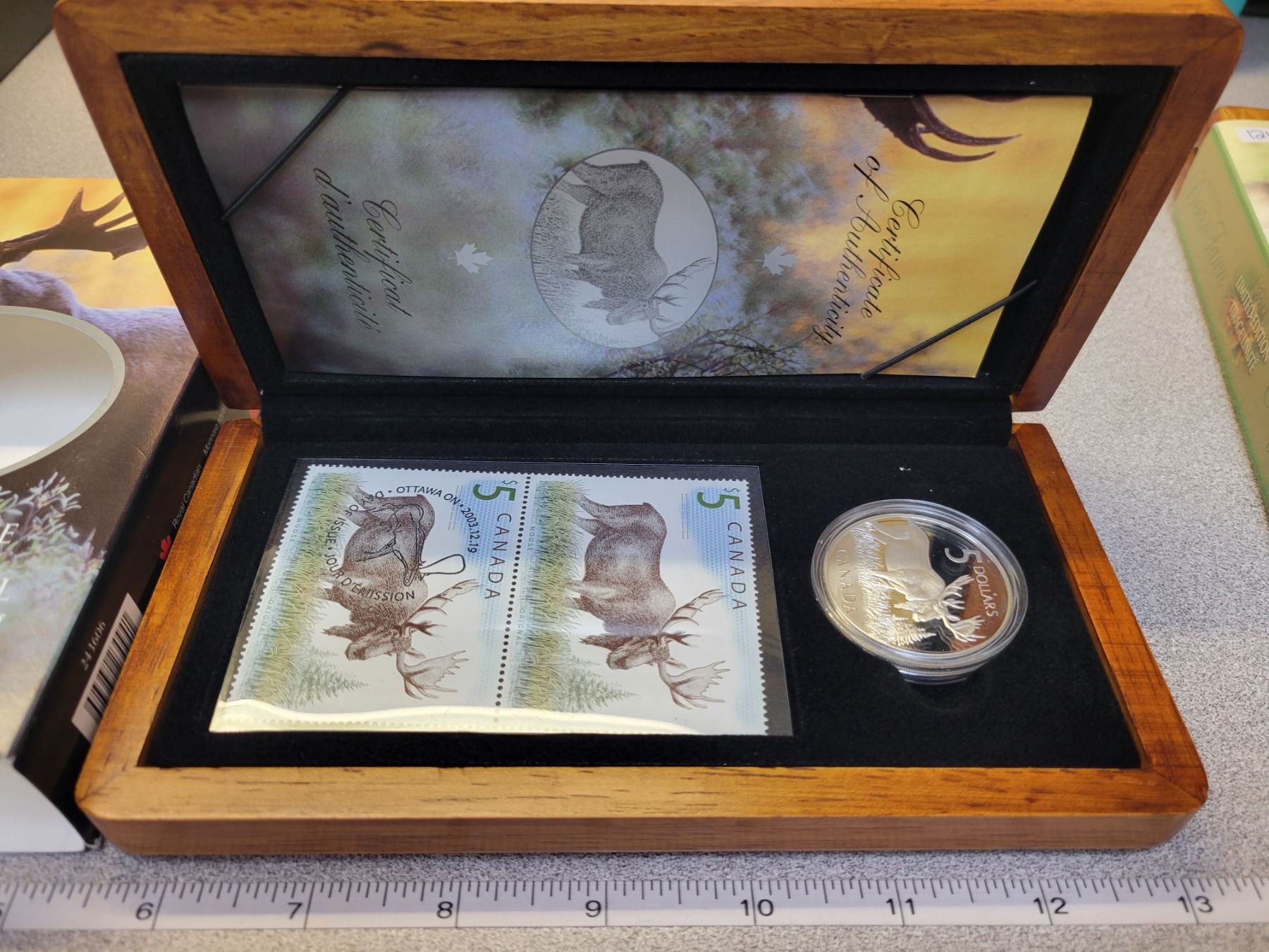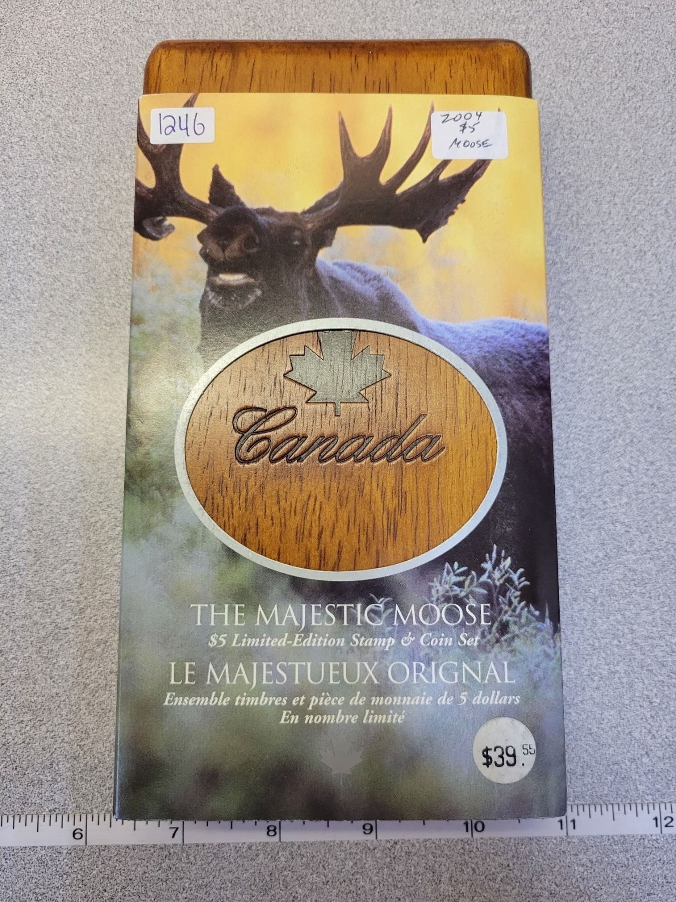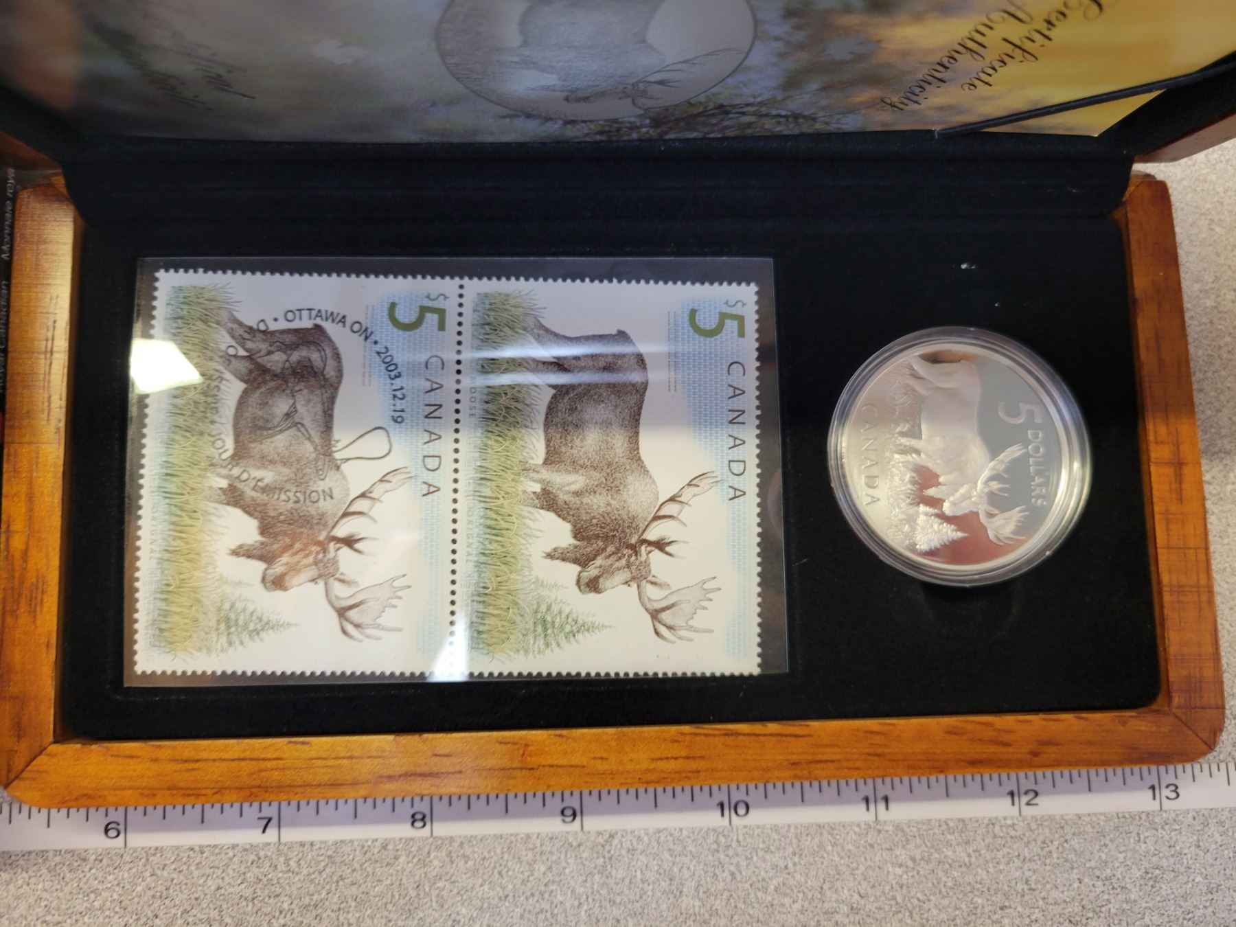 2004 $5 The Majestic Moose Limited Edition Stamp & Coin Set. Includes .9999 Pure Silver Proof Majestic Moose only found in this set as well as 2 $5 Moose stamps. Housed in its original case & box of issue.