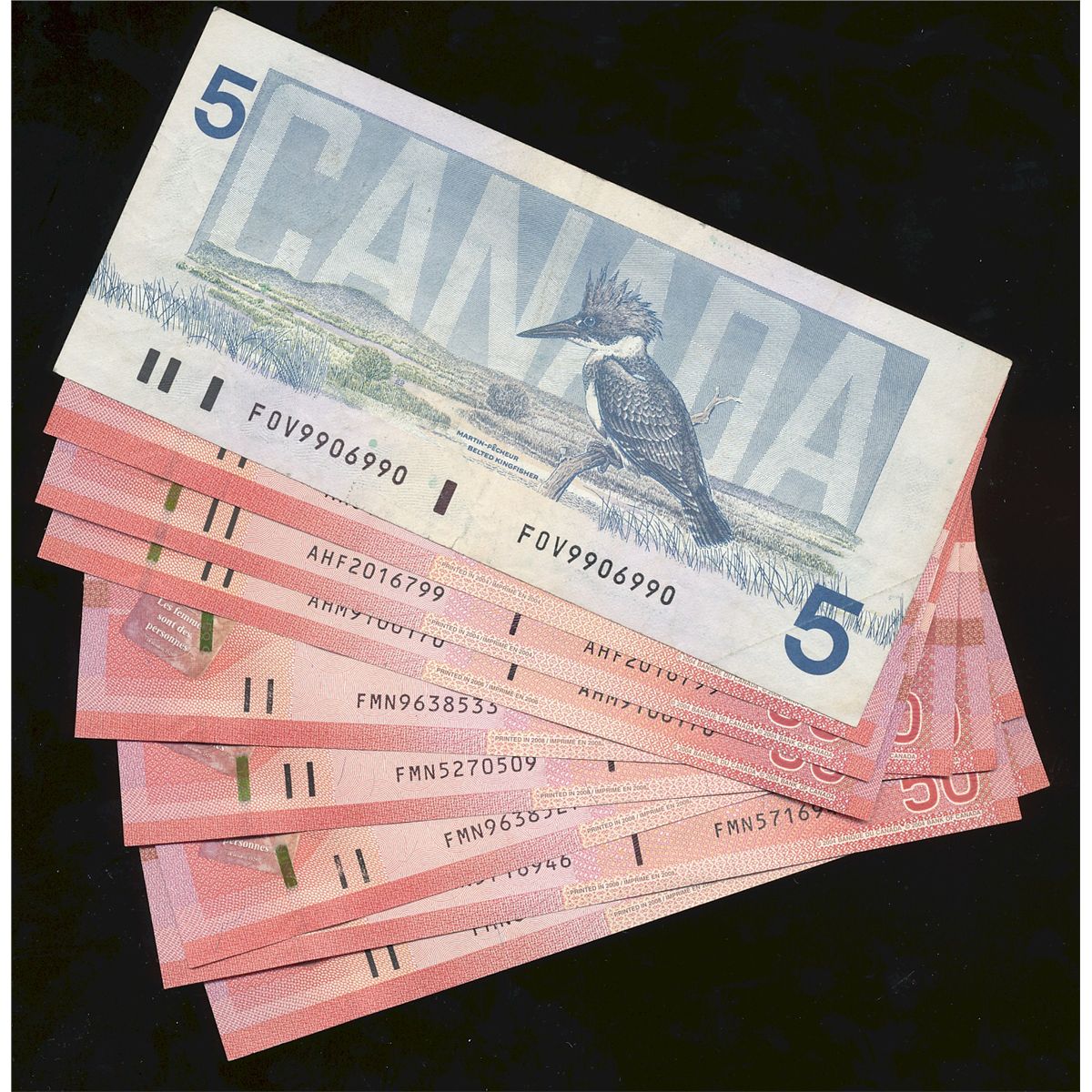 2004 $50 BC-65a(3) & BC-65b(5), along with 1986 $5 Circ. Lot of 9 notes VF to EF