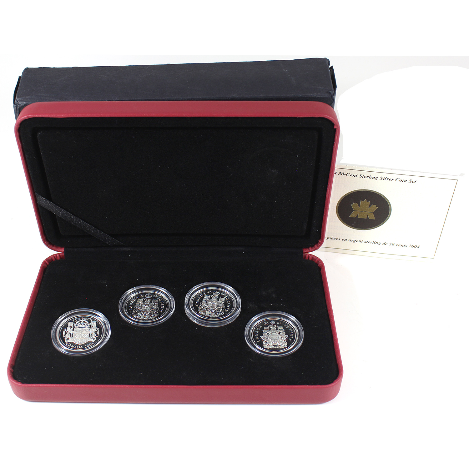 Each coin shows a different effigy of Queen Elizabeth II through her reign, as well as how the coat of arms on the 50-cent coin changed through the years. Outer box is worn.