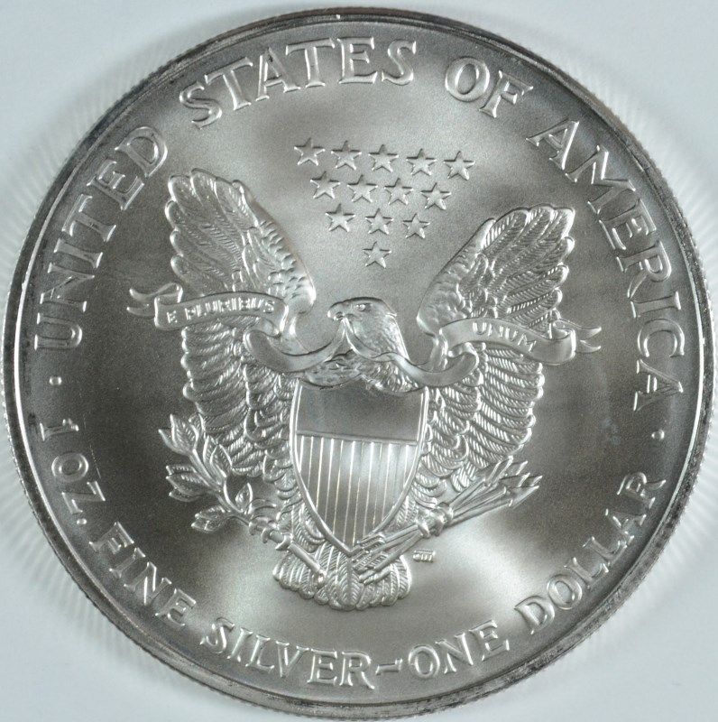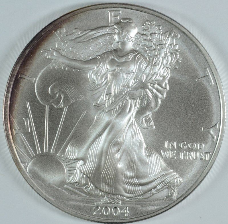 2004 AMERICAN SILVER EAGLE, GEM UNC SOME TONING.