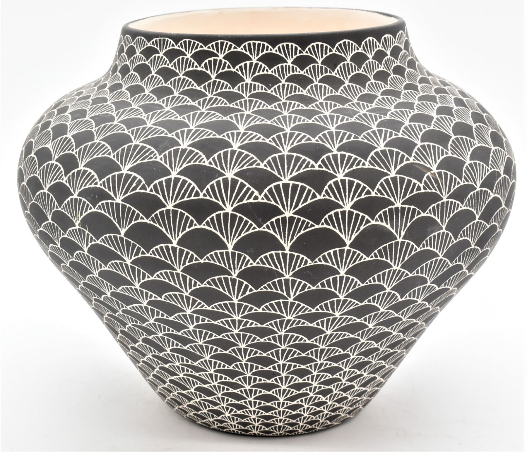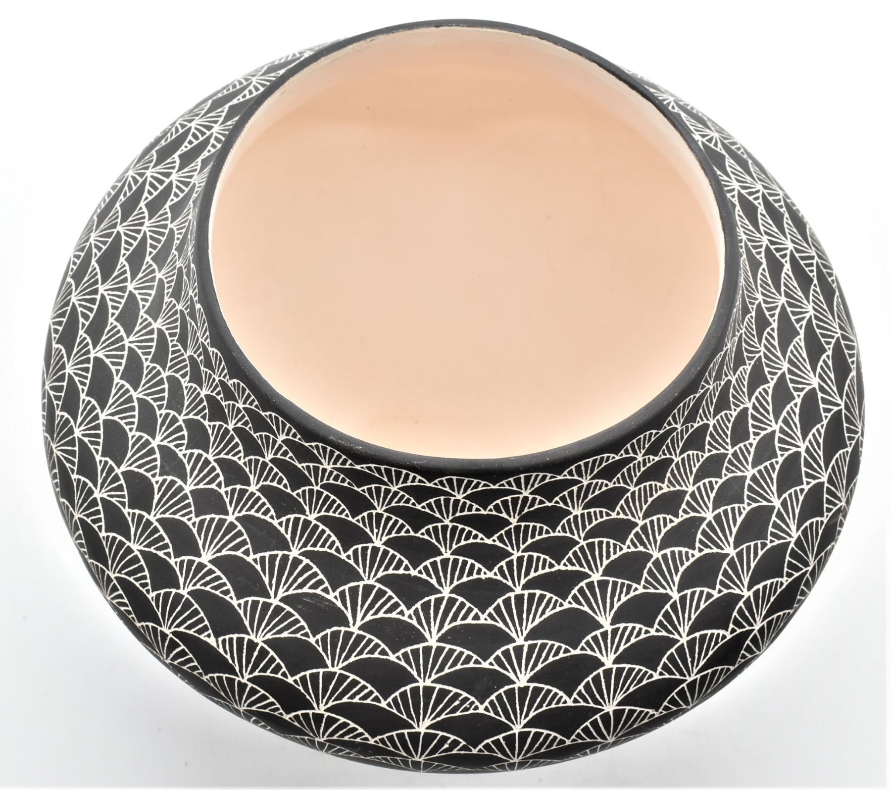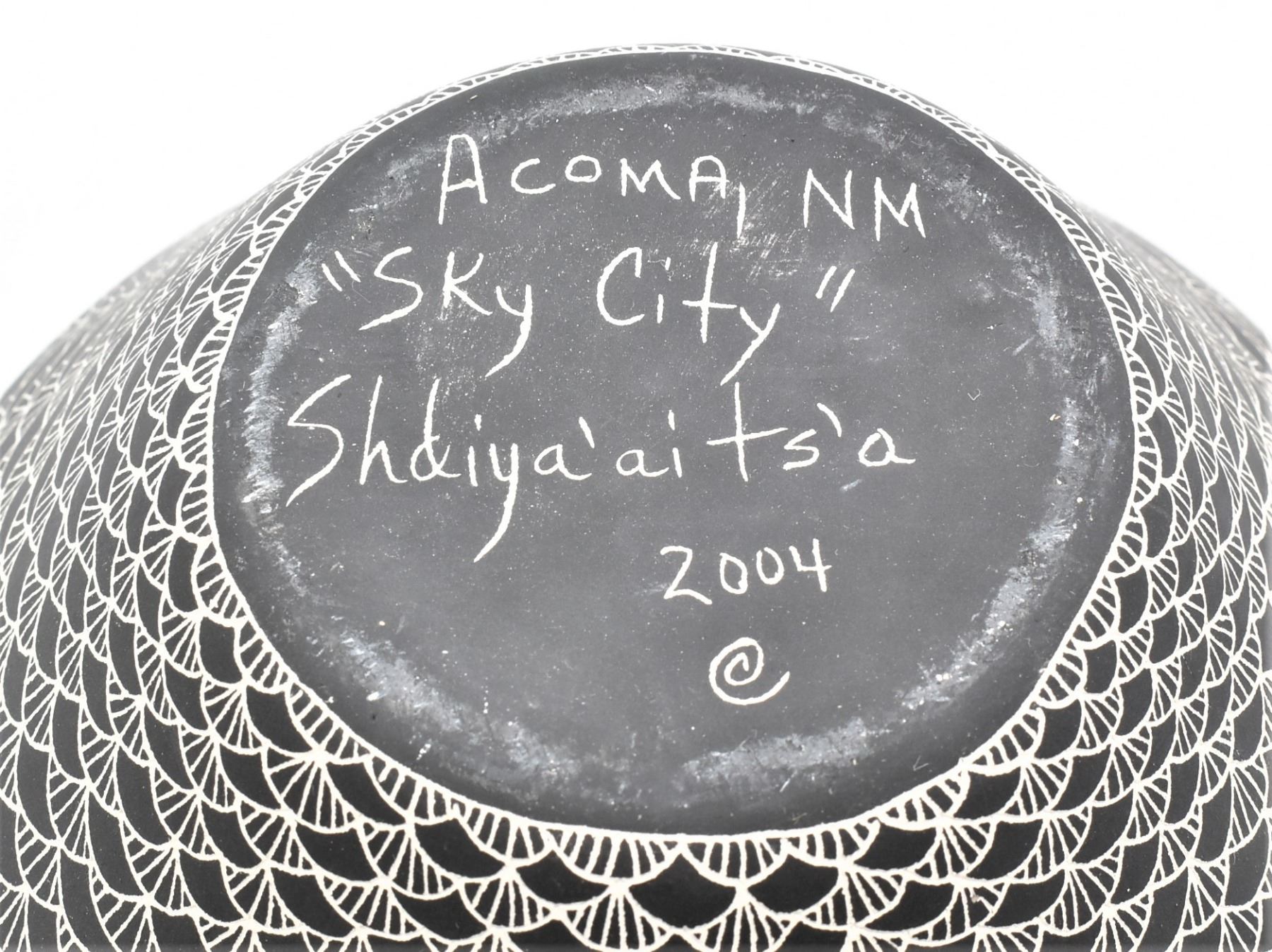 2004 Acoma Etched Eye Dazzler Pottery Bowl by Shdiya'aits'a, measures 7'' x 9'' and is signed on the bottom, FYI: ''Award winning Acoma artist, Shdiya'aits'a creates traditional polychrome pottery at Acoma Pueblo, the oldest continuously occupied pueblo in the US. She paints kiva steps, butterflies, parrots, lizards, and abstract designs on her unique pots.''