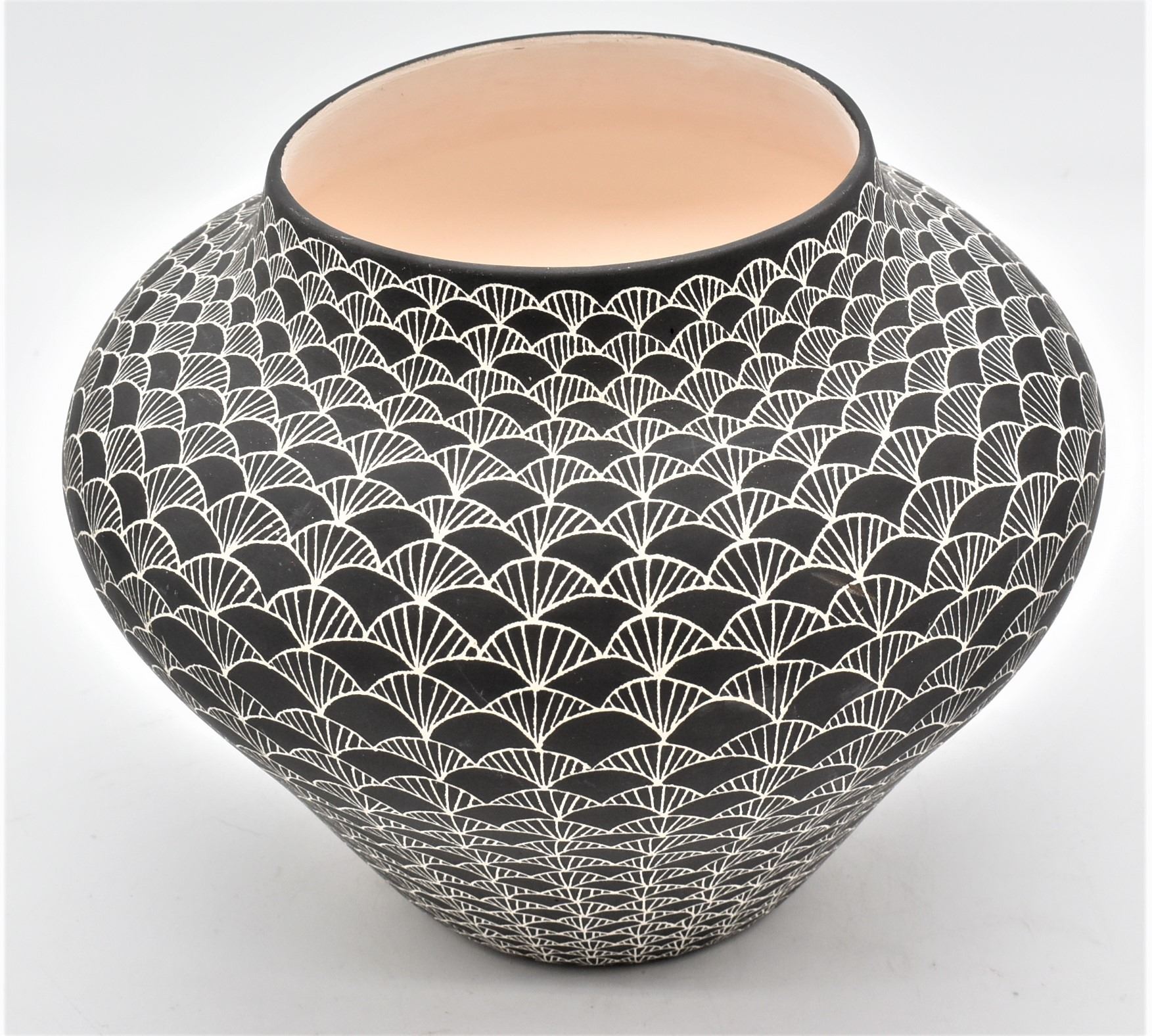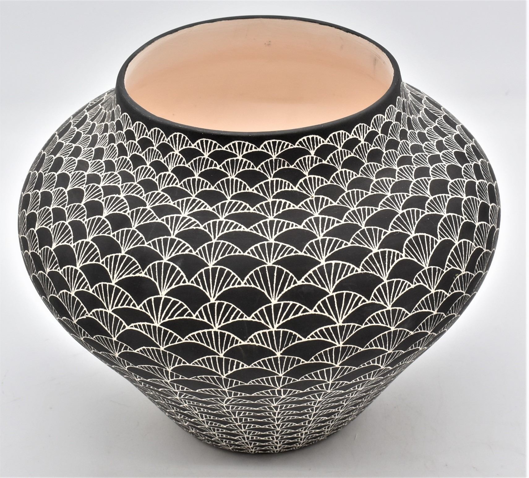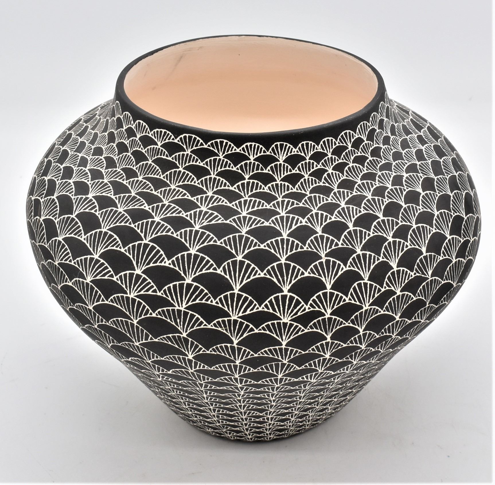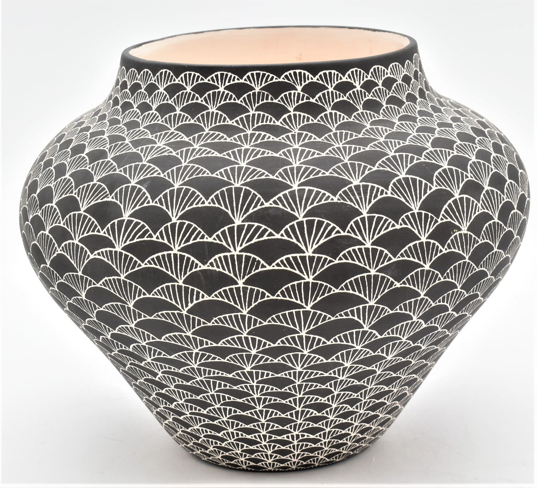 2004 Acoma Etched Eye Dazzler Pottery Bowl by Shdiya'aits'a, measures 7'' x 9'' and is signed on the bottom, FYI: ''Award winning Acoma artist, Shdiya'aits'a creates traditional polychrome pottery at Acoma Pueblo, the oldest continuously occupied pueblo in the US. She paints kiva steps, butterflies, parrots, lizards, and abstract designs on her unique pots.''