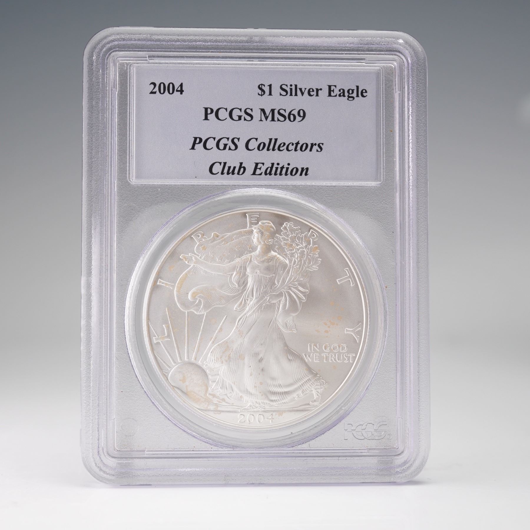 2004 American Silver Eagle one-dollar coin, certified by PCGS as MS69 and labeled Collectors Club Edition. The obverse features Adolph A. Weinman's classic Walking Liberty design, depicting Liberty draped in the U.S. flag, striding toward the sunrise with branches of laurel and oak in her arm, inscribed LIBERTY, IN GOD WE TRUST, and the date 2004. The reverse, designed by John Mercanti, shows a heraldic eagle with a shield, olive branch, and arrows beneath a cluster of stars, encircled by the inscriptions UNITED STATES OF AMERICA, 1 OZ. FINE SILVER, and ONE DOLLAR. Struck in .999 fine silver, this near-perfect example displays brilliant luster and sharp strike details. Net Silver 0.999 troy oz.