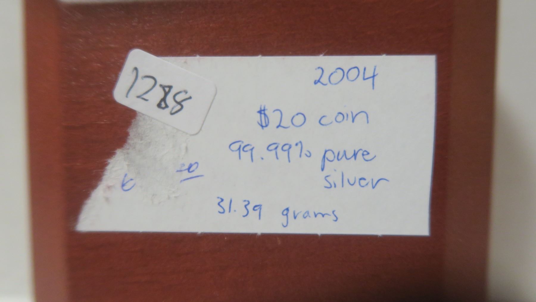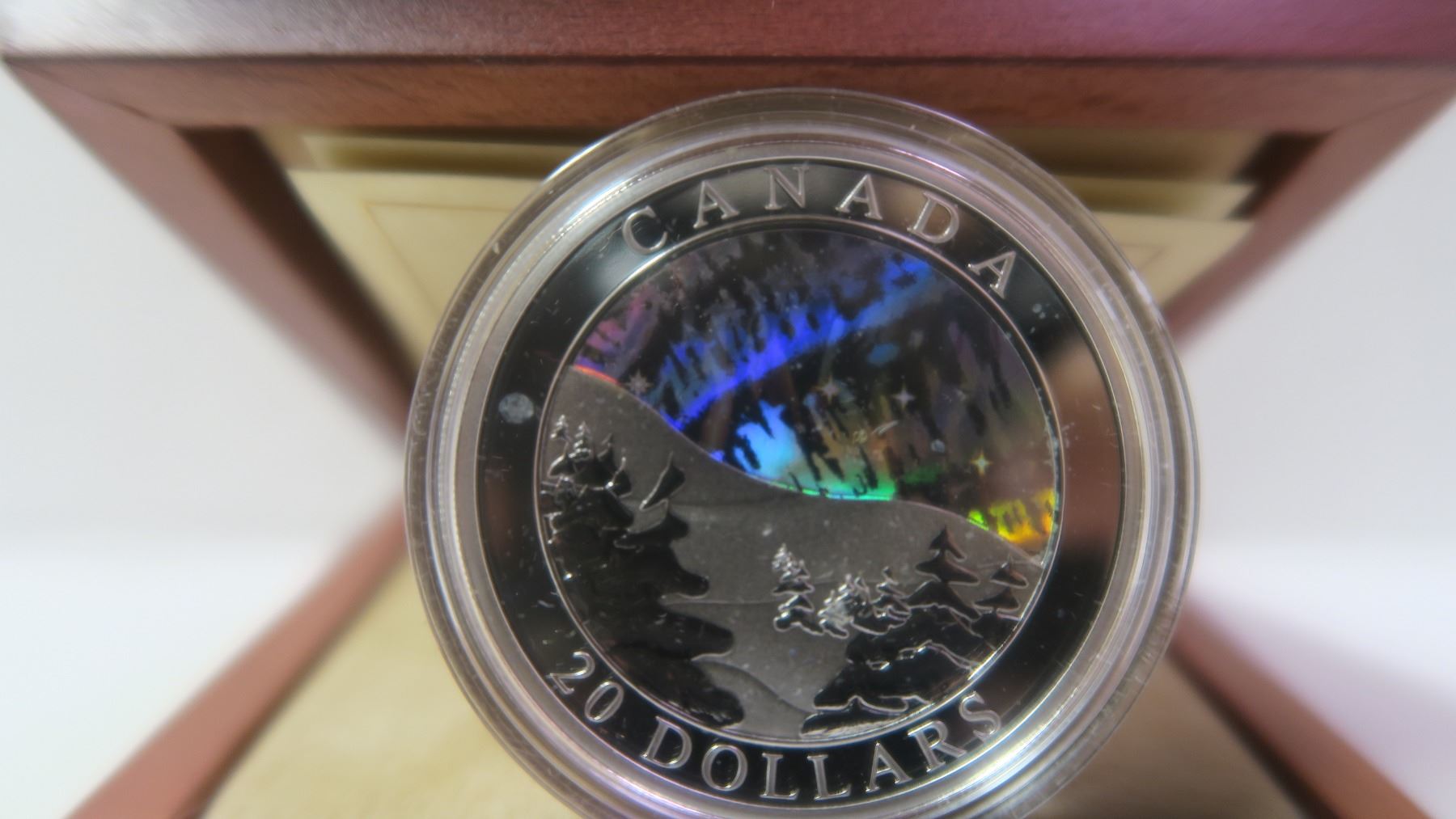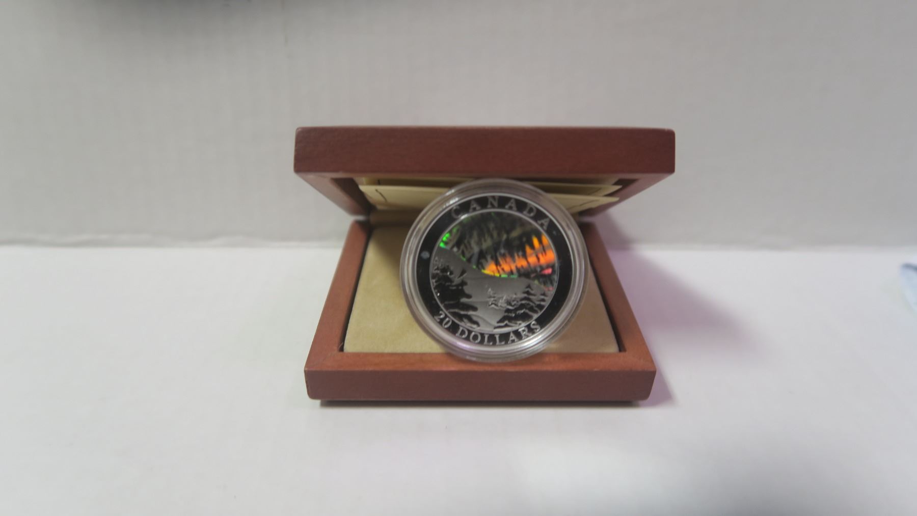 2004 Aurora Borealis $20. A beautiful coin that depicts the Northern Lights. 99.99% pure Silver. Proof. Housed in its original case of issue.