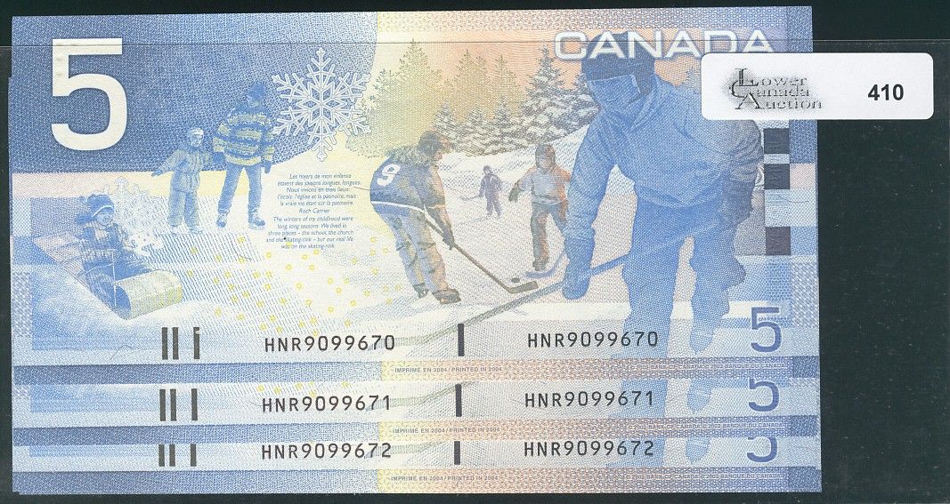 2004 Bank of Canada; 5 Dollars, Gem UNC-65 Charlton BC-62bA, HNR9099670-671-672-673-674 insert Range 8.920M - 9.200M. Lot of 5 consecutive replacement notes.