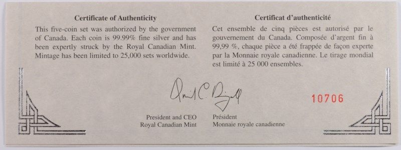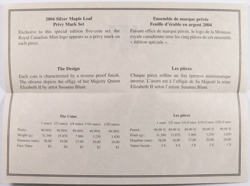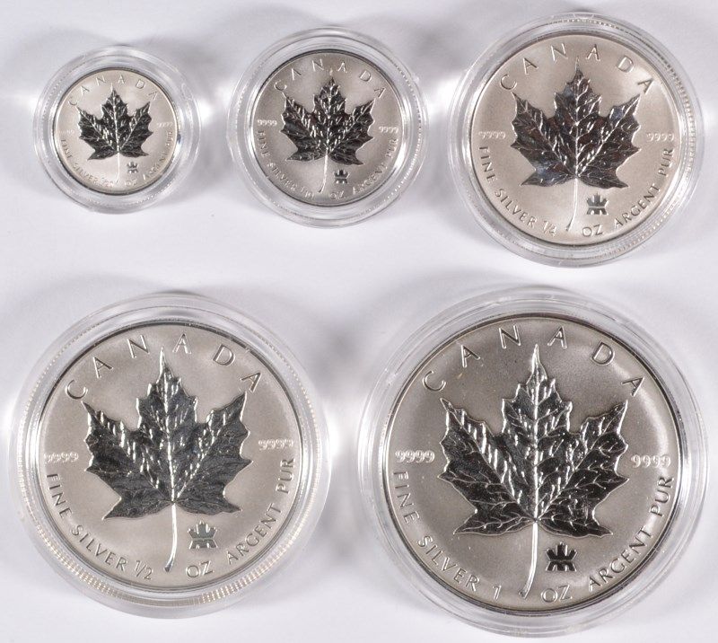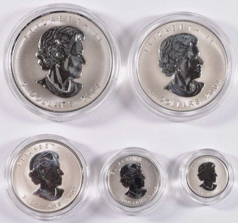 2004 CANADIAN SILVER MAPLE LEAF ( 5 ) PIECE SET ORIGINAL BOX AND COA,