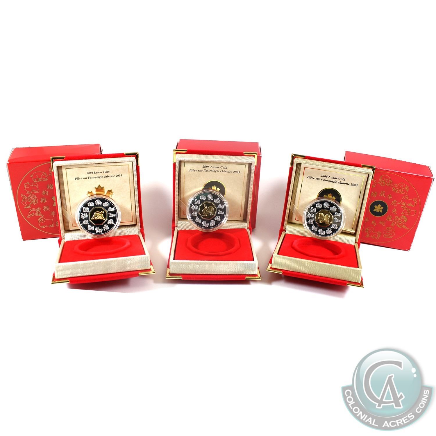 2004 Canada $15 Year of the Monkey, 2005 Year of the Rooster & 2006 Year of the Dog Sterling Silver & Gold Plated Cameo Coins (2005 & 2006 coins are toned). 3pcs