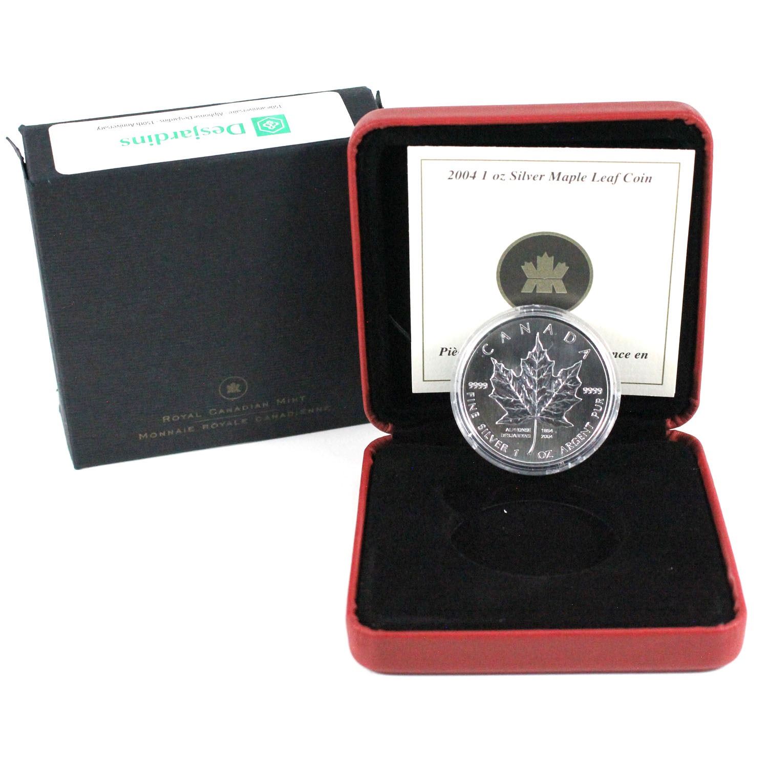 2004 Canada Desjardins Privy Mark 1oz. Silver Maple Leaf(Tax Exempt) .Coin has toning spots and capsule is impaired)