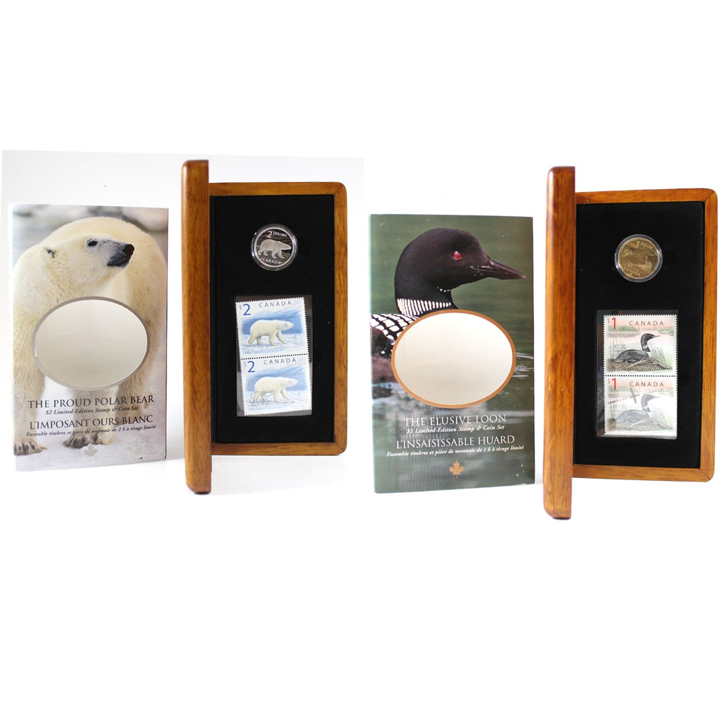 2004 Canada Elusive Loon Dollar Coin and Stamp Set & 2004 Canada Proud Polar Bear $2 Coin and Stamp Set. Coins come with all original Mint packaging (light scuff marks on outer sleeves)