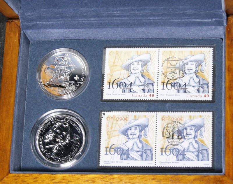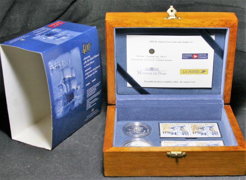 2004 Canada Ile Sainte-Croix Coins & Stamp Set by RCM & Canada Post - In Original Wooden Box