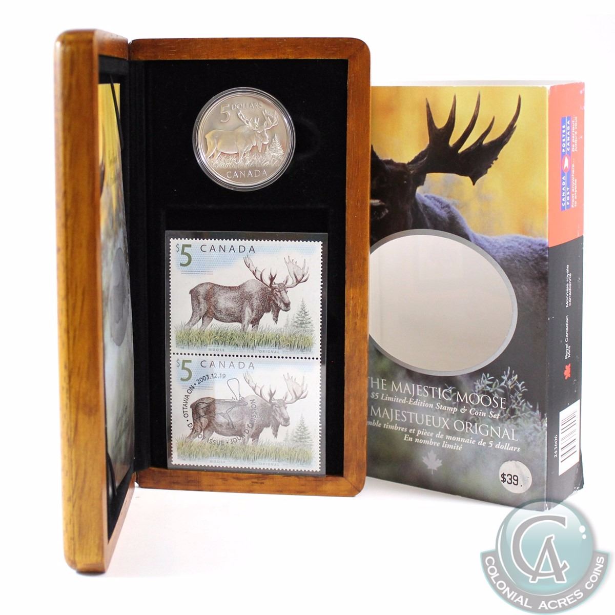 2004 Canada Majestic Moose $5 Coin and Stamp Set (Capsule lightly scratched & outer sleeve lightly worn)