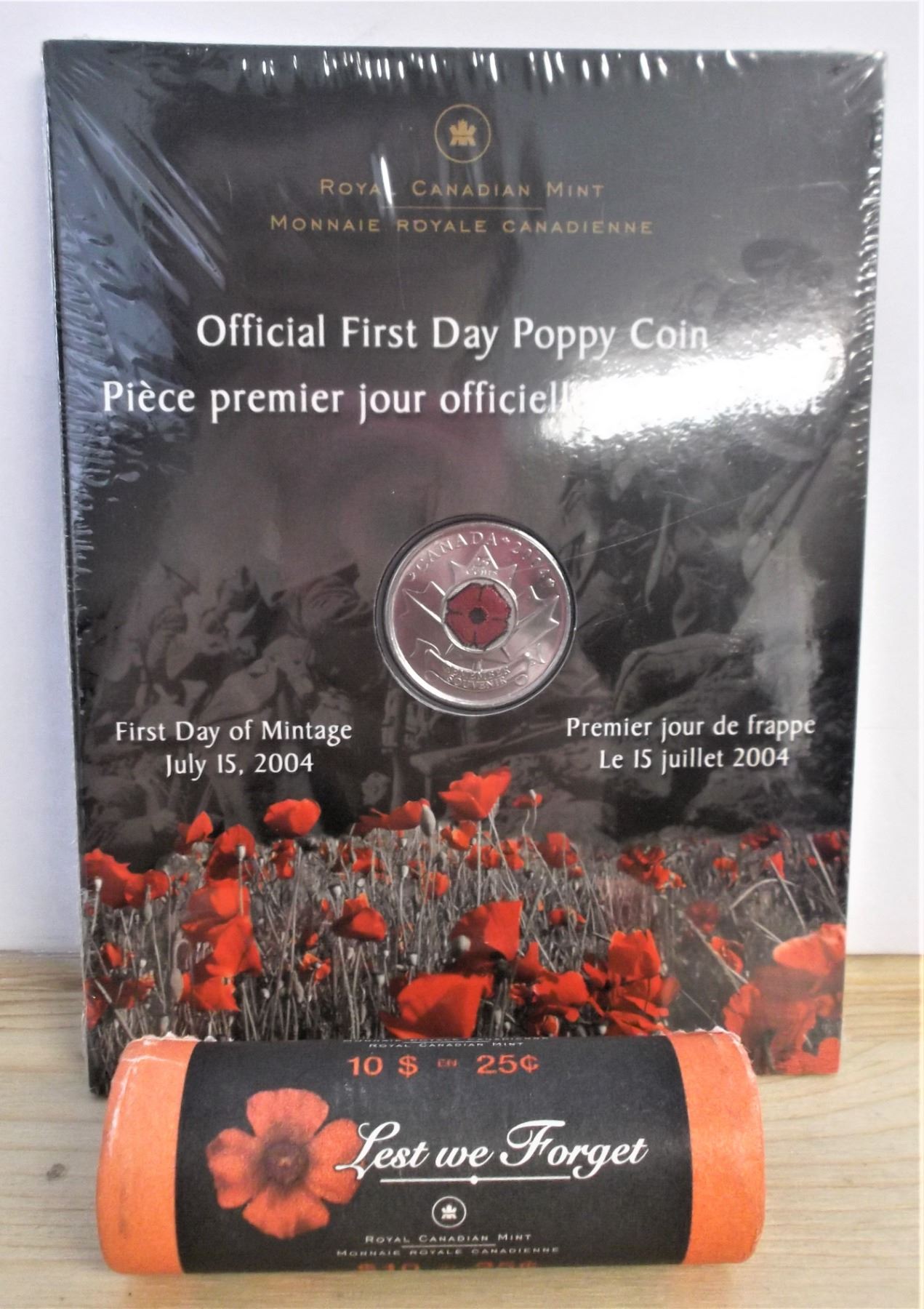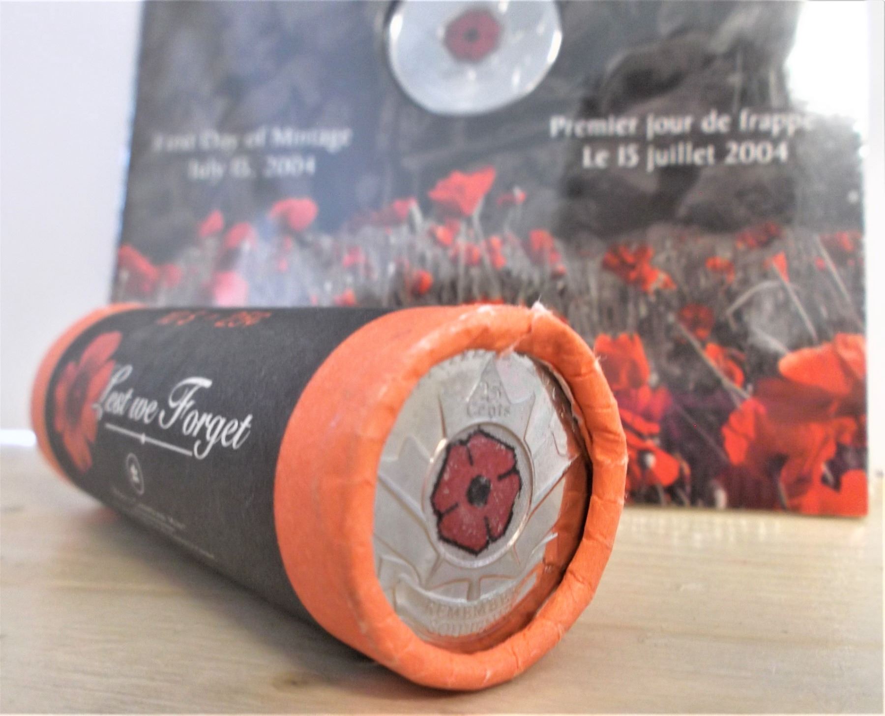 2004 Canadian Quarter Mint Roll - Least We Forget and 2004 Canadian 25 Cent Official First Day Poppy Coin with Info Card
