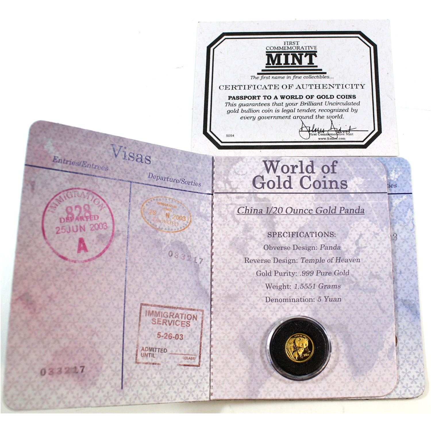2004 China 1/20oz Fine Gold Panda (Tax Exempt). Comes encapsulated in a World of Gold Coins Passport with COA.