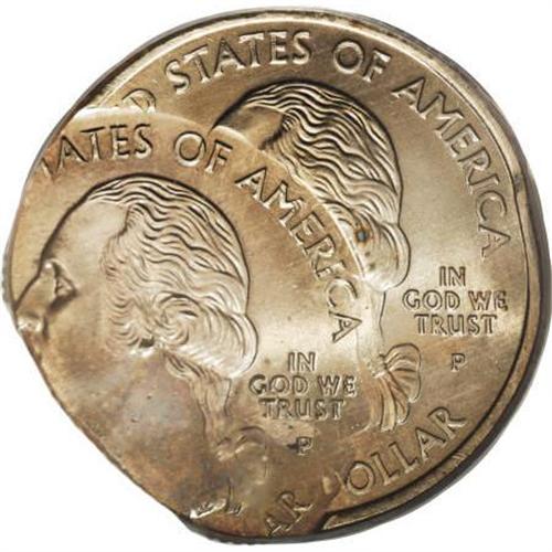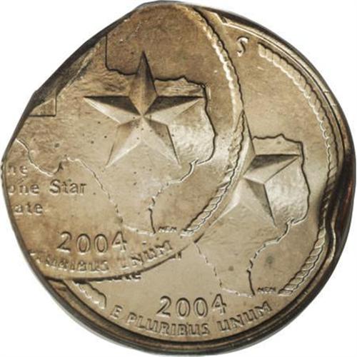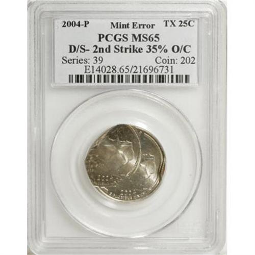 <B>2004-P 25C Texas Statehood Quarter--Double Struck, Second Strike 35% Off Center--MS65 PCGS.</B></I> The first strike was normal, but the second strike was widely off-center toward 10 o'clock, relative to the statehood side. The second strike is centered at 10 o'clock relative to the first strike. The statehood rim is raised at 3:30, as made from the second strike. This lustrous Gem has light golden-tan and lilac toning. Limited in grade by minor strike-throughs near the mintmarks.<BR><BR><b>Shipping:</b> Coins & Currency (<a target="_blank" href="http://www.heritageauctions.com/common/shipping.php">view shipping information</a>\)