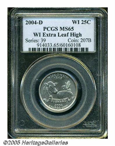 <B>2004-D<25C> Wisconsin Extra Leaf High MS65 PCGS.</B></I> A popular mint error that caused many collectors to check their pocket change last winter. A sharply struck, lightly toned, and satiny Gem without obtrusive marks.