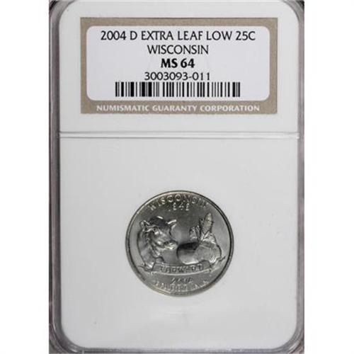<B>2004-D 25C Wisconsin Extra Leaf Low NGC, </B></I>and a <B>2004-D 25C Wisconsin Extra Leaf High MS64 NGC. </B></I>NGC Census: (0/0). PCGS Population (1723/1016). (#814033)<BR><BR><b>Shipping:</b> Coins & Currency (<a target="_blank" href="http://www.heritageauctions.com/common/shipping.php">view shipping information</a>)