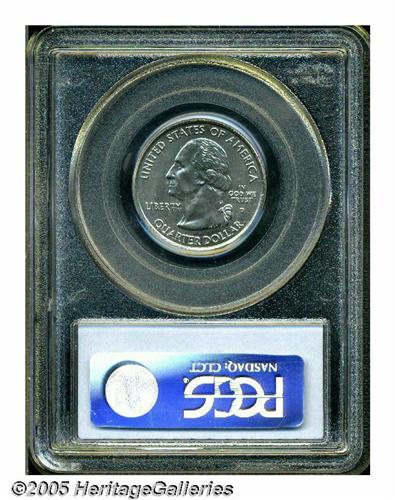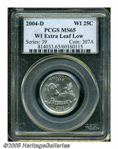 <B>2004-D<25C> Wisconsin Extra Leaf Low MS65 PCGS.</B></I> Lustrous surfaces display just a faint touch of light tan color. A few contact marks are apparent on Washington's cheek and neck, near both eyes of the cow, and on the cheese. Nicely struck throughout. PCGS has presently certified 16 finer (5/05).