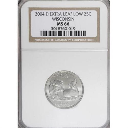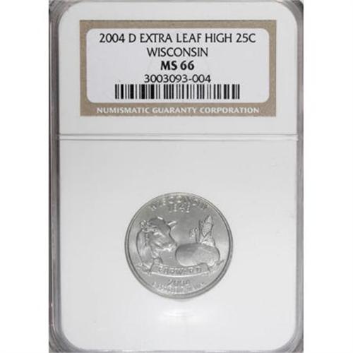 <B>2004-D 25C Wisconsin Extra Leaf Low MS66 NGC.</B></I> and a <B>2004-D 25C Wisconsin Extra Leaf High MS66 NGC. </B></I>NGC Census: (0/0). PCGS Population (122/3). (#814033)<BR><BR><b>Shipping:</b> Coins & Currency (<a target="_blank" href="http://www.heritageauctions.com/common/shipping.php">view shipping information</a>)