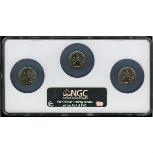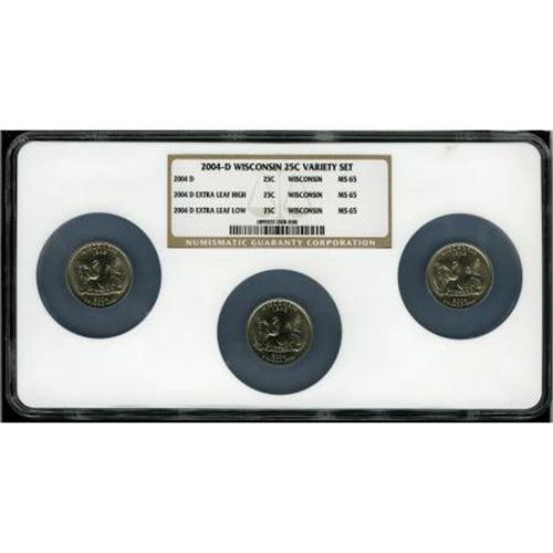<B>2004-D 25C Wisconsin Quarter Three-Coin Set MS65 NGC.</B></I> The set includes: <B>2004-D 25C Wisconsin MS65 NGC</B></I>, <B>2004-D 25C Wisconsin Extra Leaf High MS65 NGC</B></I>, and a <B>2004-D 25C Wisconsin Extra Leaf Low MS65 NGC</B></I>. Each coin is a strongly lustrous and brilliant Gem. An interesting three-coin set, housed in a single NGC holder, that contains both of the popular and controversial varieties that appeared on Washington quarters.<BR><BR><b>Shipping:</b> Coins & Currency (<a target="_blank" href="http://www.heritageauctions.com/common/shipping.php">view shipping information</a>)