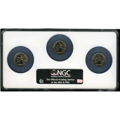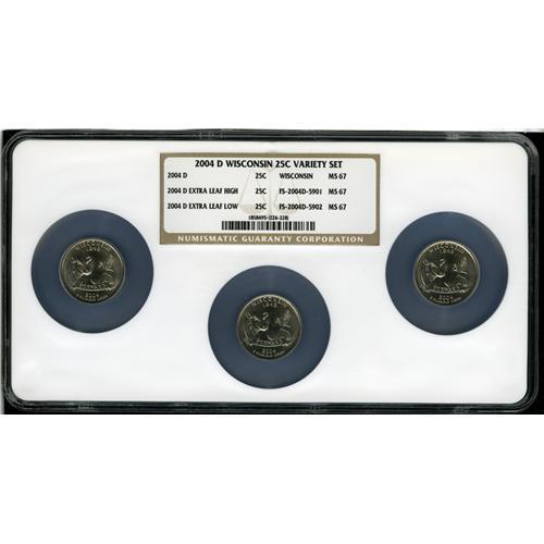 <B>2004-D<25C> Wisconsin Variety Set MS67 NGC.</B></I> The set includes: <B>2004-D No Extra Leaf;</B></I> <B>2004-D Extra Leaf High,</B></I> and a <B>2004-D Extra Leaf Low.</B></I> A lustrous and undisturbed trio with few of the "planchet abrasions" that typically affect business strike statehood quarters. MS67 is the highest practical grade obtainable for this set, since NGC has certified only two Extra Leaf Low Varieties in MS68 with none finer.
