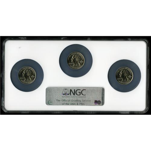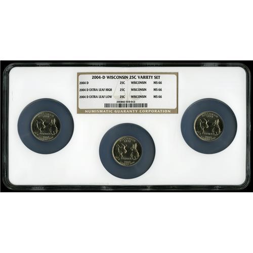 <B>2004-D<25C> Wisconsin Variety Set NGC.</B></I> The set includes: <B>2004-D No Extra Leaf MS66;</B></I> <B>2004-D Extra Leaf High MS66,</B></I> and a <B>2004-D Extra Leaf Low MS66.</B></I> All three pieces are lustrous, brilliant, and refreshingly unmarked. Any faint abrasions present were likely on the planchets prior to the strike. The two Extra Leaf varieties are the keys to the Statehood series.