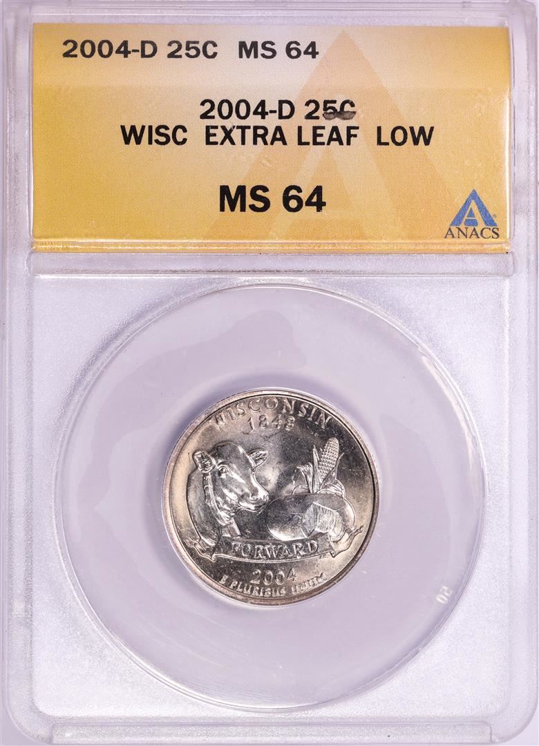 One 2004-D Wisconsin Extra Leaf Low Quarter Coin ANACS MS64. ANACS Certified.