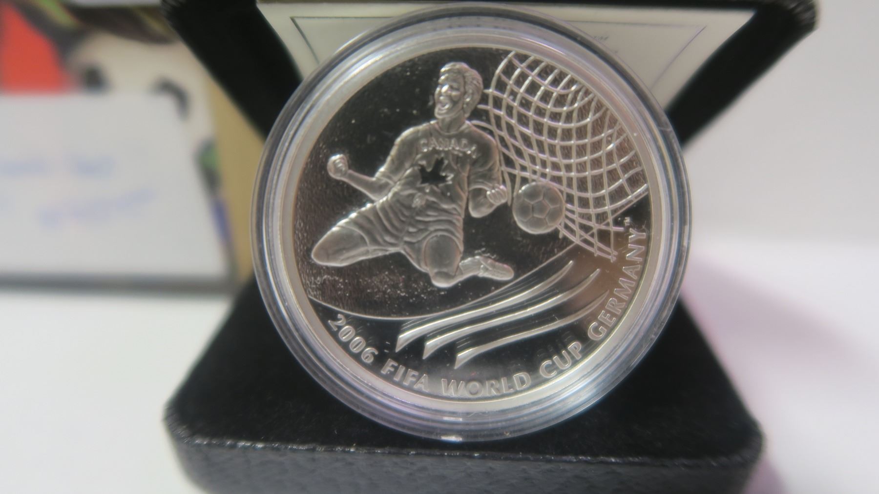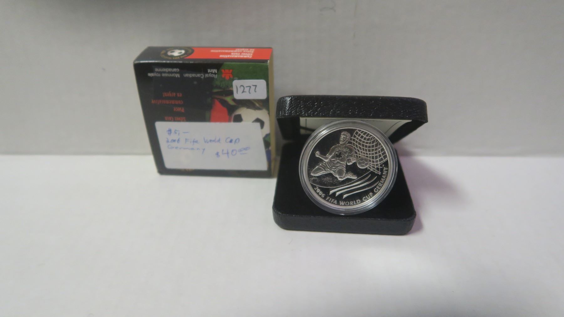 2004 FIFA World Cup Commemorative $5. 99.99% pure Silver. Proof. As issued by the Royal Canadian Mint. Housed in its original case and box of issue.