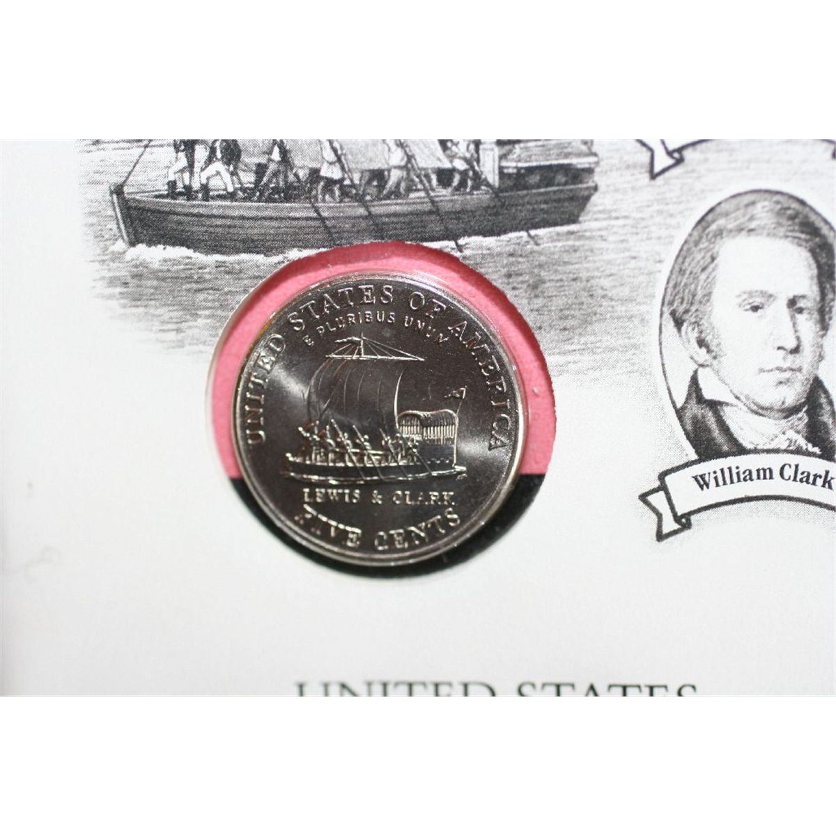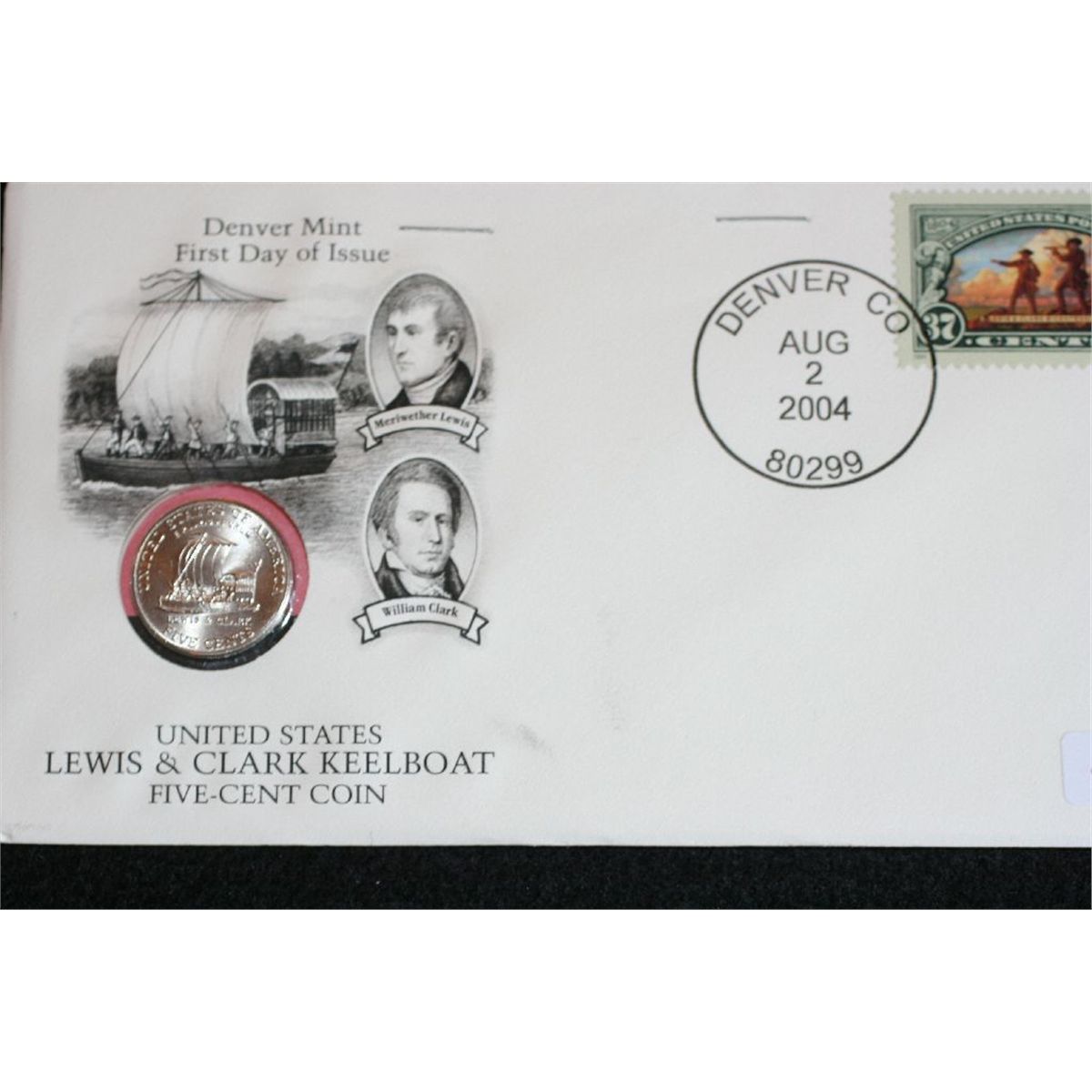 2004 First Day Issue Stamp w/Lewis & Clark Keelboat nickel, Denver mint