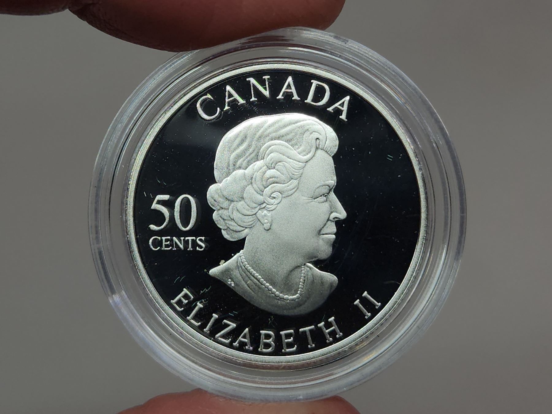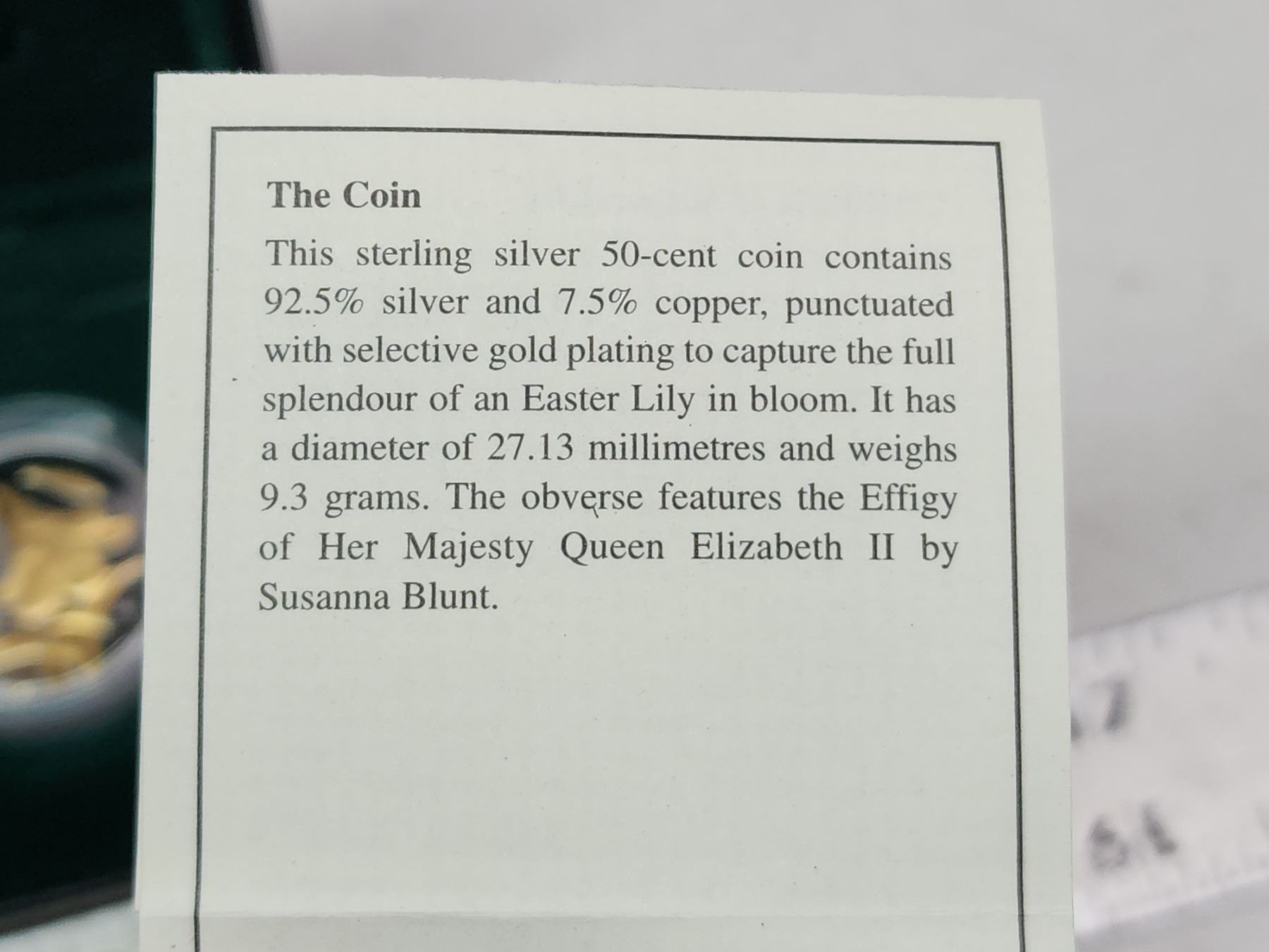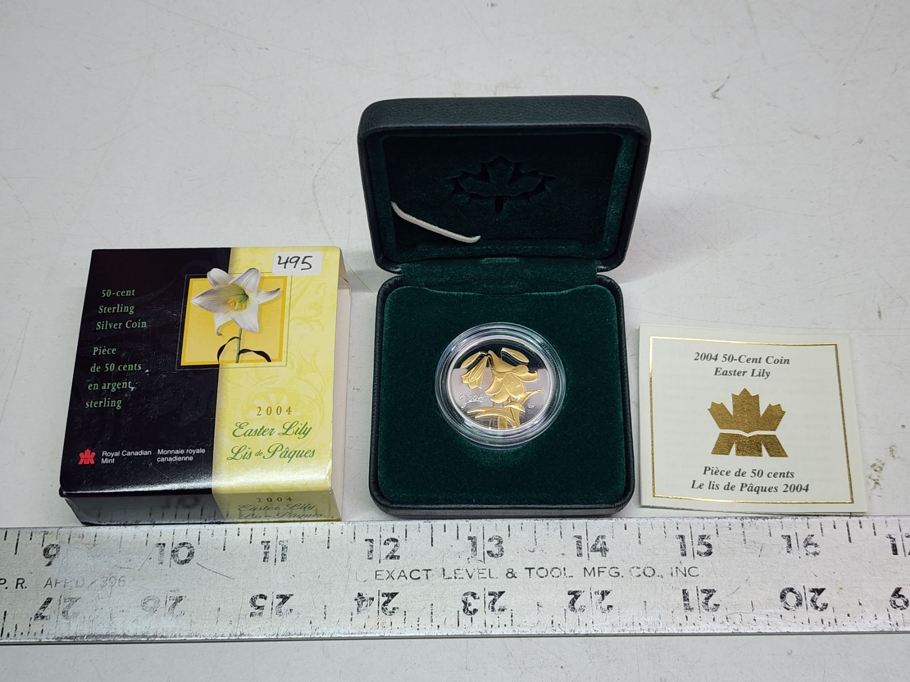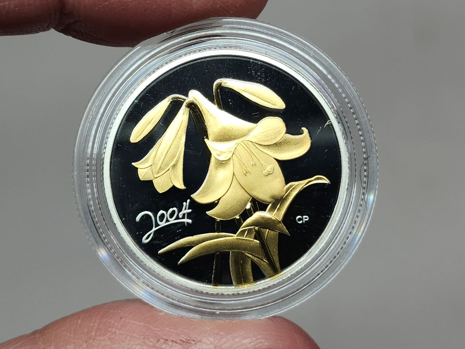 2004 Golden Easter Lily Sterling Silver 50 Cents. 24-karat Gold Plated. Proof with Ultra Heavy Cameo. Housed in its original Royal Canadian Mint case & box of issue.